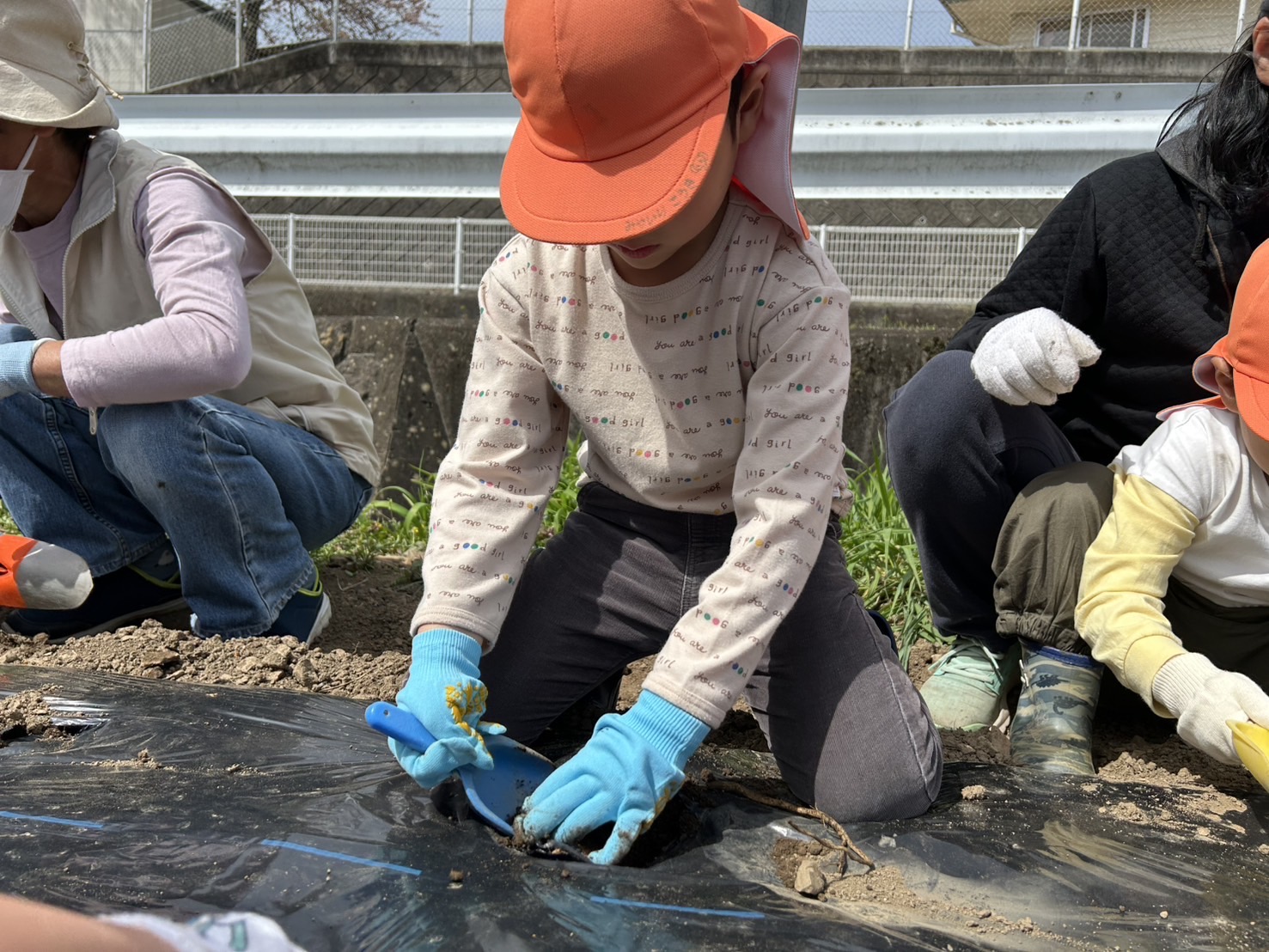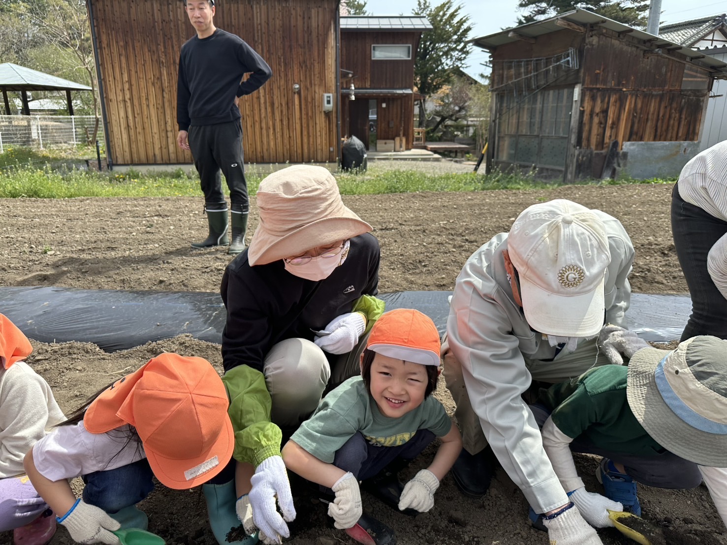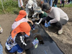 今年度より畑活動のサポートをして下さる地域の方、西島さん・工藤さんに植え方を教えて頂きました。