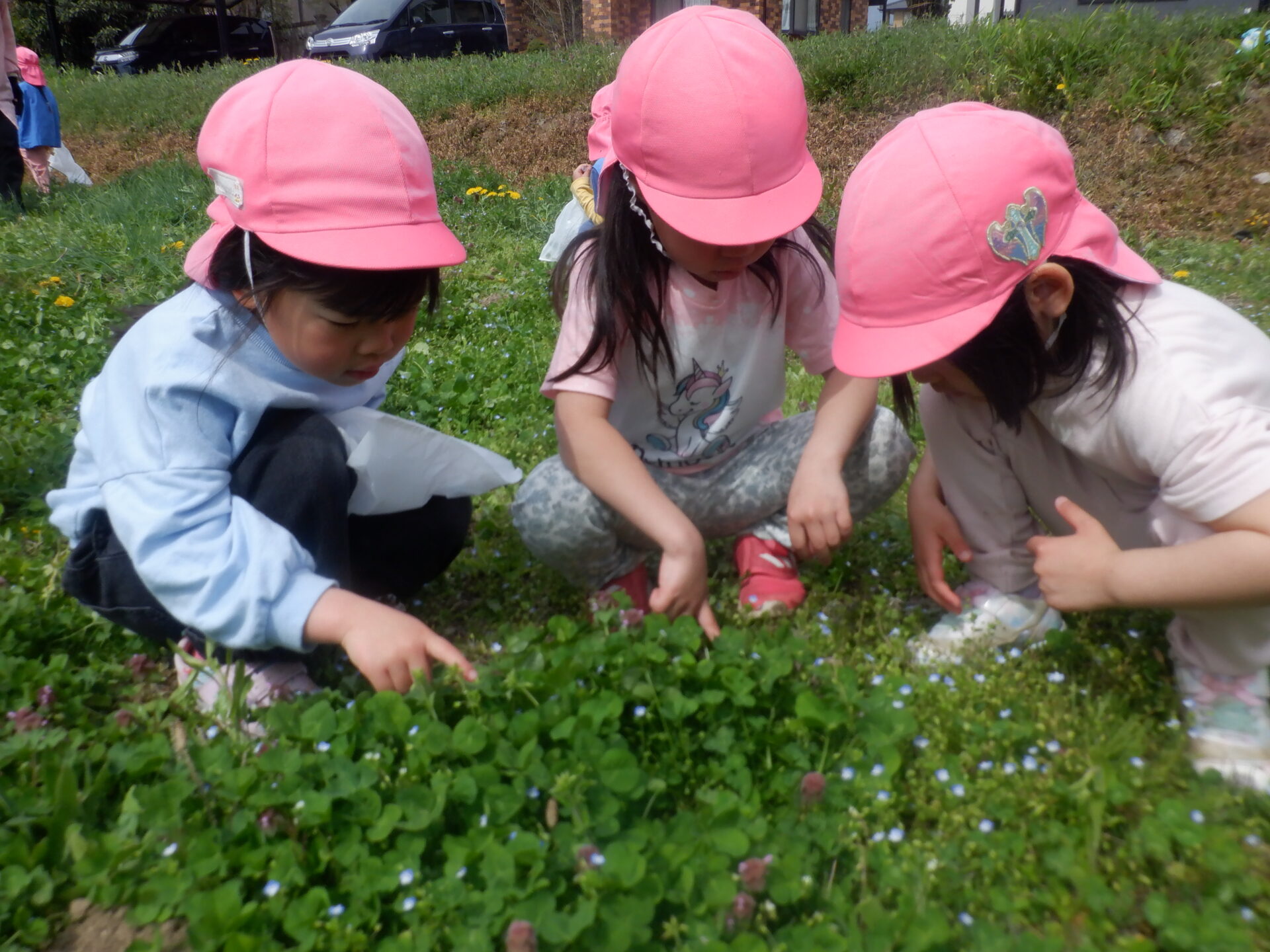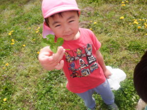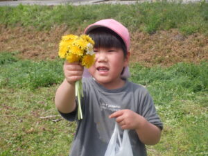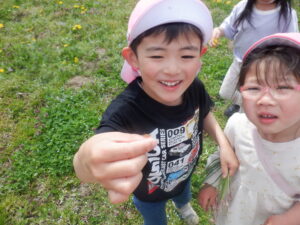ノビル採りに夢中な子、四つ葉のクローバーを探す子、貝殻や虫を発見した子、たんぽぽブーケ作りをする子・・・広い畑なのに、気づくと5~6人で集まって何かに夢中になっているこども達がとてもかわいらしかったです。変な虫にきゃー!と騒ぎ、でも本当は触りたかったたり、興味を持って春の植物や生き物に触れることができたこども達でした。実体験の中で、感じたり、想いを巡らせたりすることで、より自然に対する興味も持てたように思います。