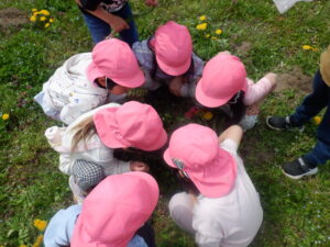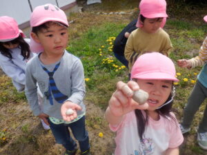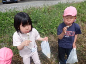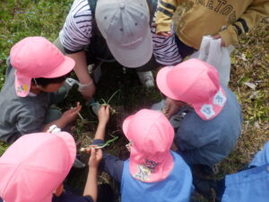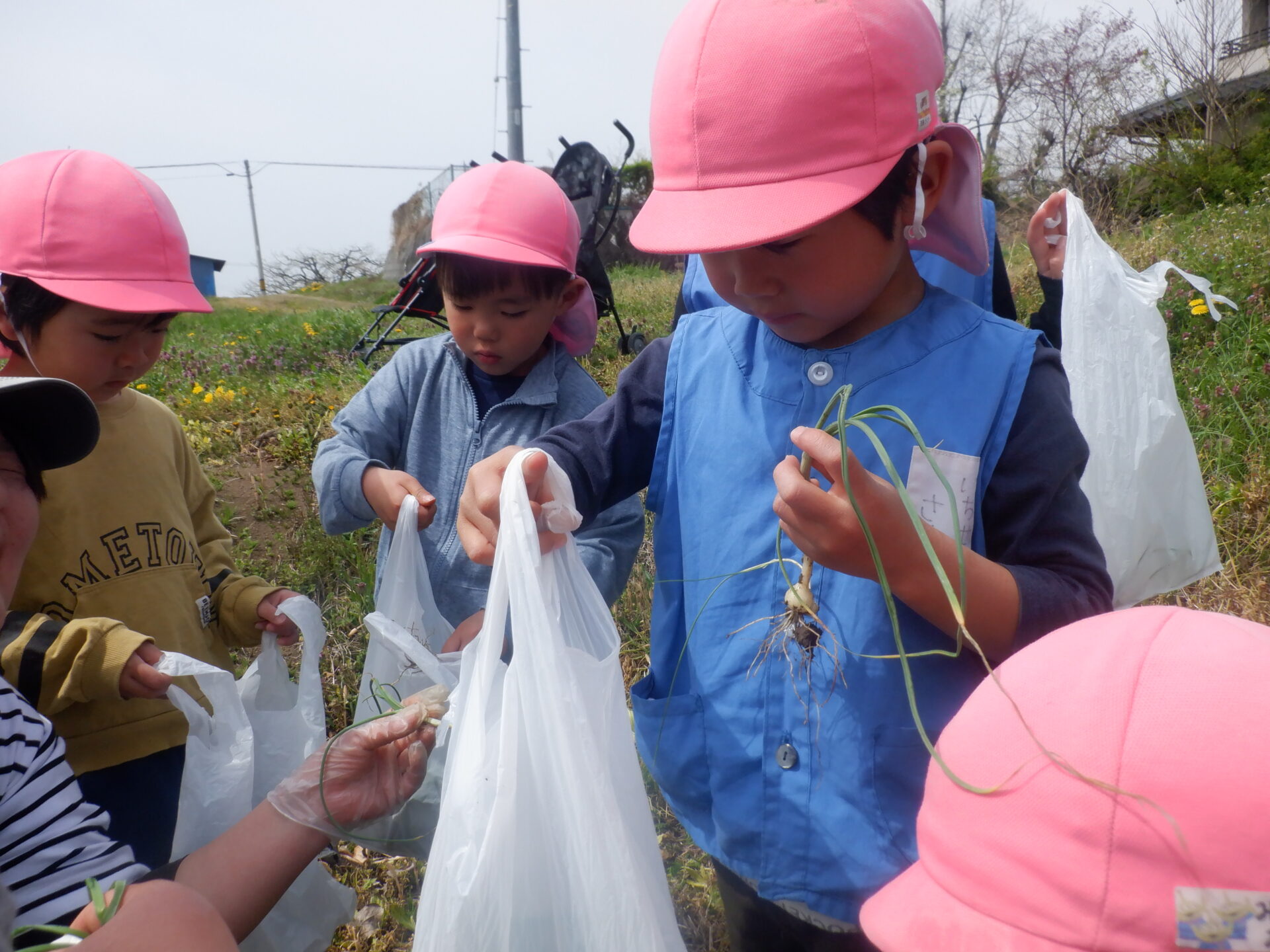 さっそくノビルを見つけるとスコップを持っている担任に「ちょっとここ掘ってみて~。」とリクエスト。スコップで掘っていく様子を見つめます。自分で抜こうとすると、根本で切れてしまうことを学んだこども達。引き抜きたい気持ちを我慢して待ちます。
