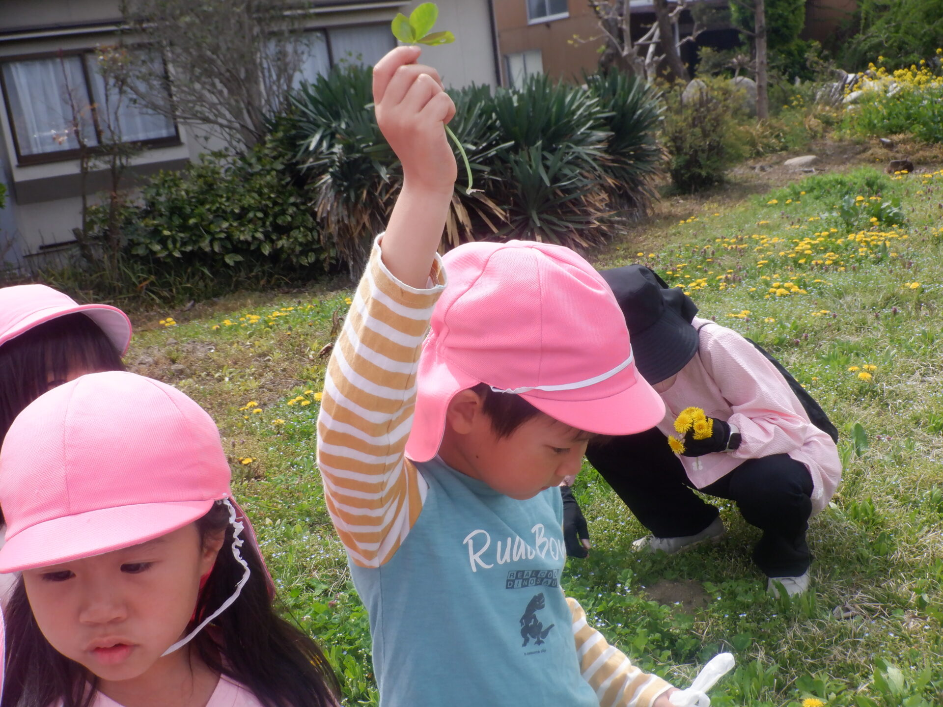 「四つ葉発見!」最初に見つけたA君。B君が見つけたのは五つ葉で誇らしげに見せてくれました。