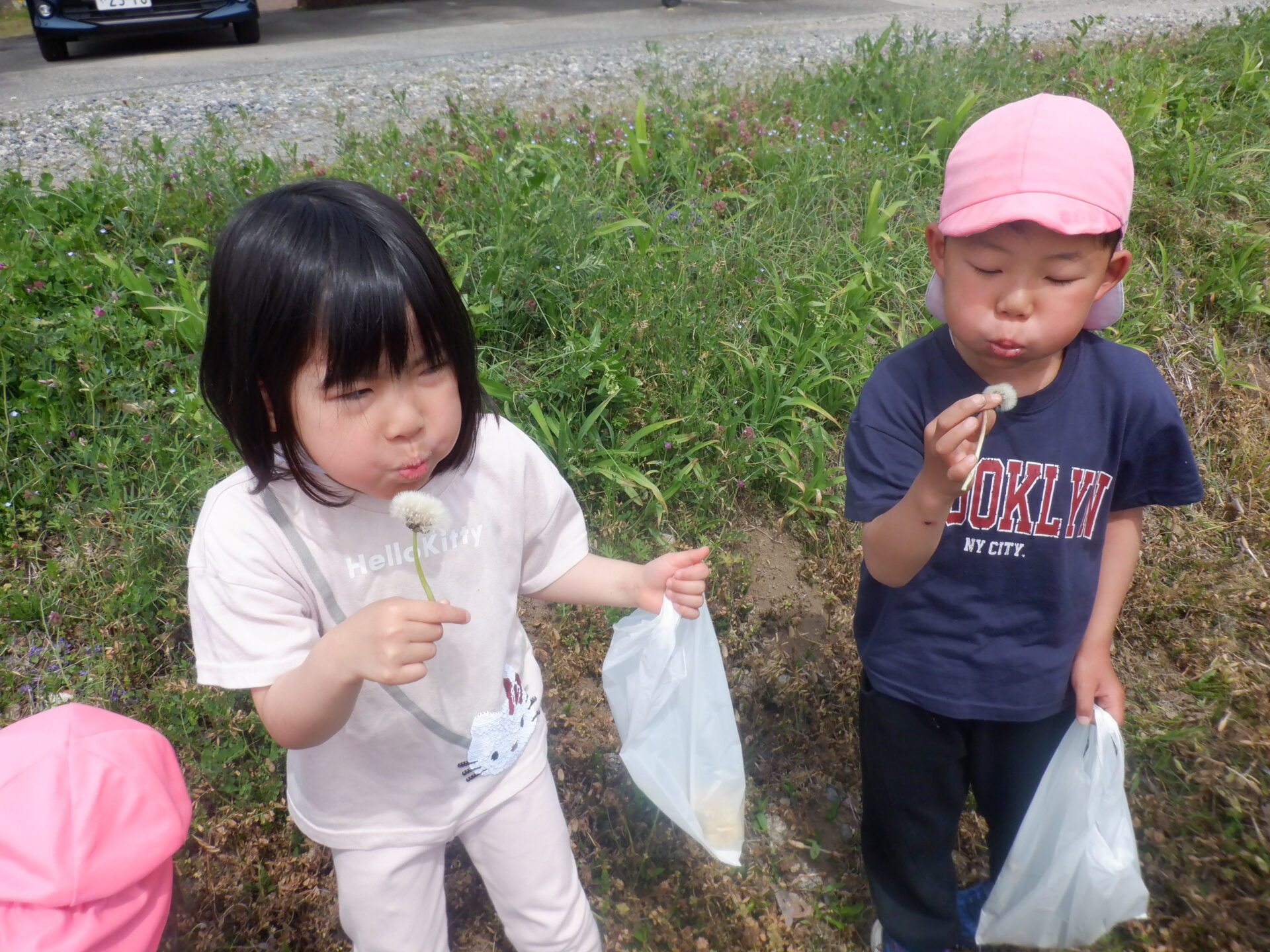 たんぽぽの綿毛がなかなか飛ばず苦戦するお友だち。「息がたりないんじゃない?」 と周りのお友だちにアドバイスをもらいながら一生懸命吹いてみますが、やっぱり飛ばず、「今日は飛ぶ元気がないんだ。」という結論になったようです。