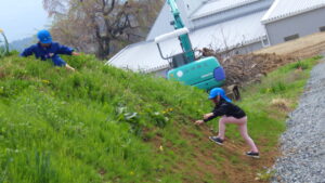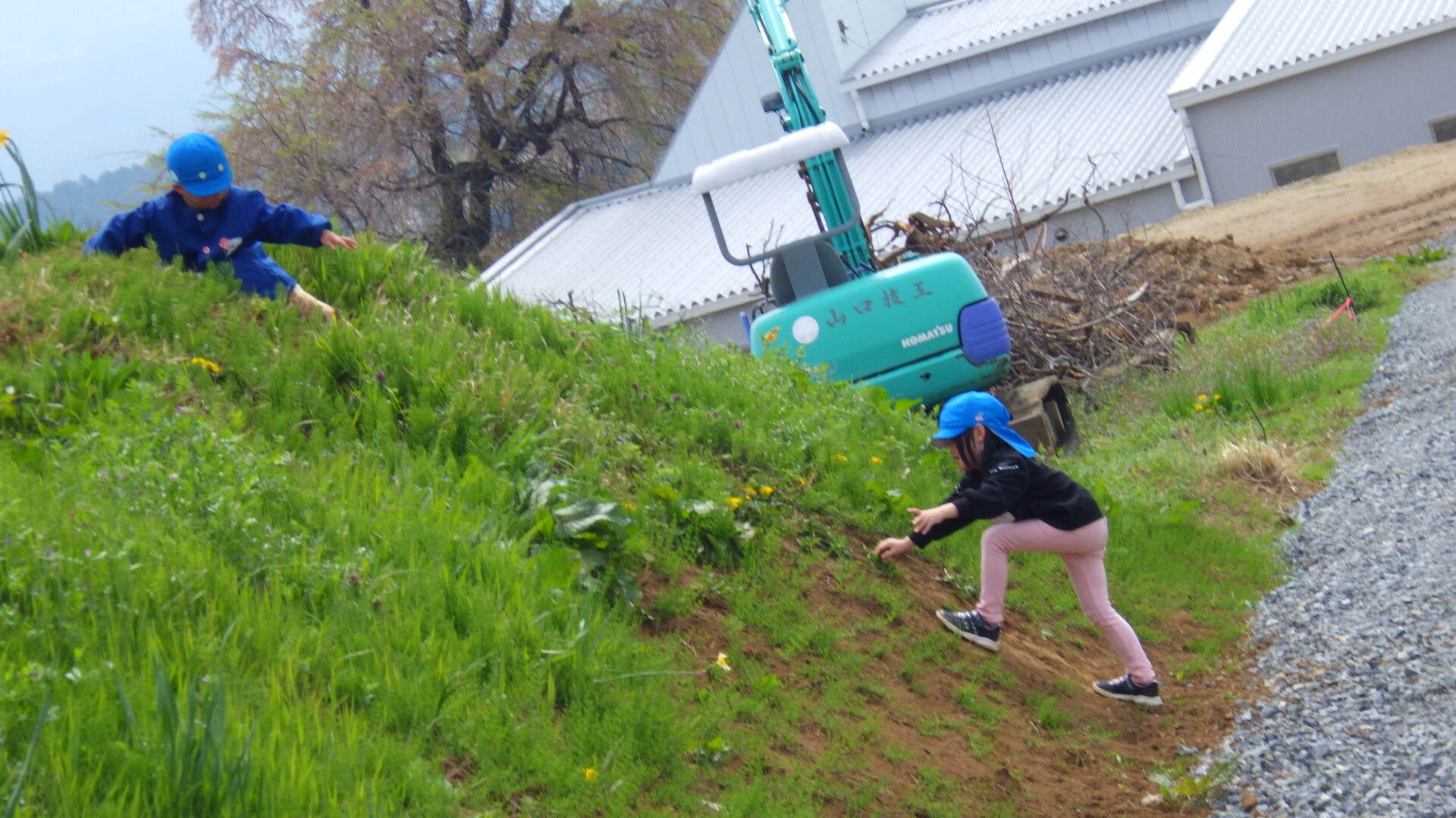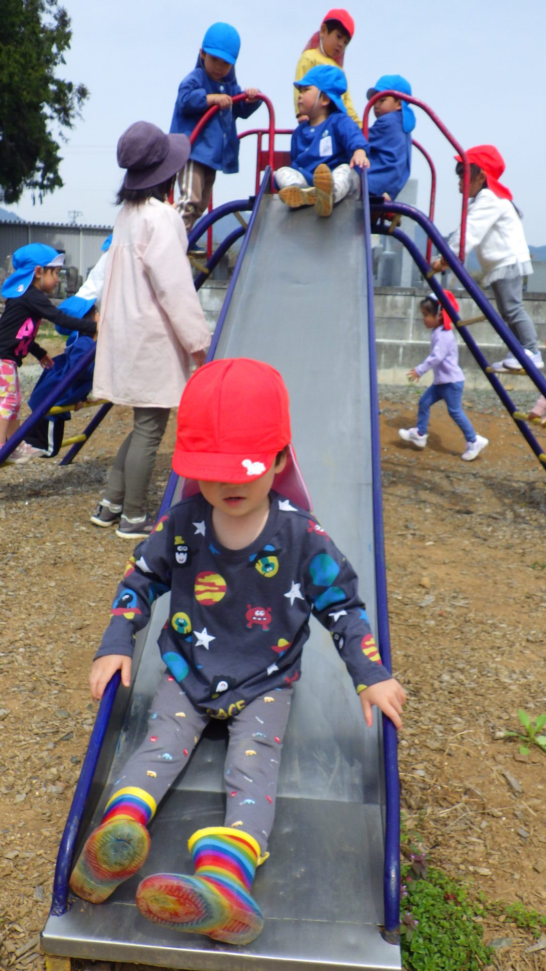 土手があれば上りたくなるのが年中さん「大丈夫か?」「手をかそうか?」と助け合う姿も見られ大きくなったことを感じます。年中さんが上った後を年少さんが真似して登っていくのですが、年中さんのようにはいかないようです。