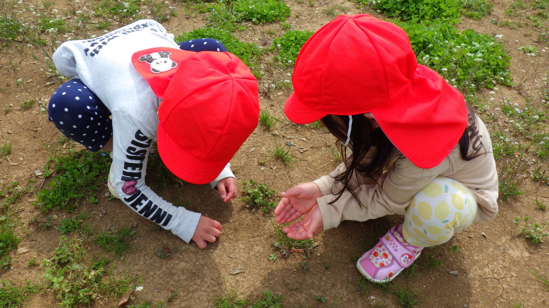 「ここにテントウムシがいる。」「早く捕まえてよ。」「私も欲しいな。」とテントウムシやアリ、カエルを見つけて捕まえようとする姿もありました。