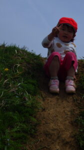 一部の土手は草が無く、滑れそうなことに気が付いたこども達。土手滑りが始まりました。
