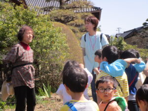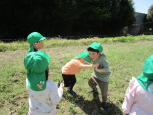 毎年ヨモギを取らせてもらっている地域の篠田さんの畑のヨモギを年長さん・年中さんで積みにいってきました。