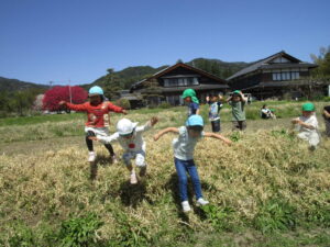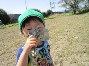 ・毎年恒例になっているヨモギ摘みとヨモギを使ったおやつ。畑を使わせてくださる篠田さん、ヨモギを摘むだけでなく、こども達に伸び伸び自由に遊べせてくださるので、園ではできない経験もたくさんさせていただいている。