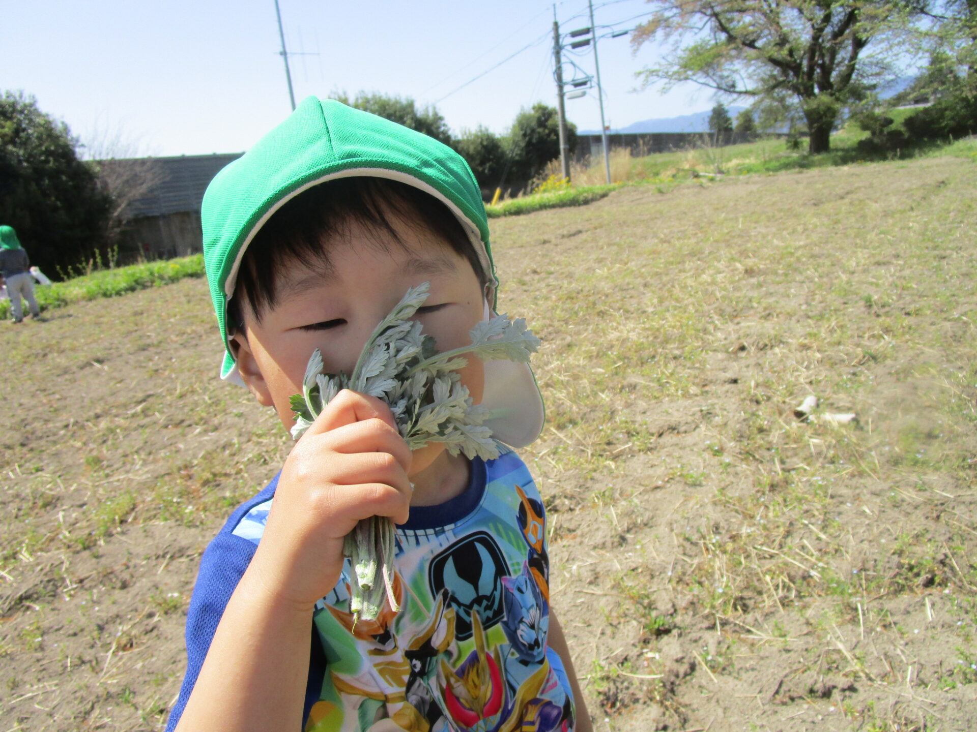 担任からヨモギの見分け方や摘み方を教えてもらい、さっそくこども達のヨモギ摘みが始まりました。年長さんが年中さんに教えている姿も見られました。