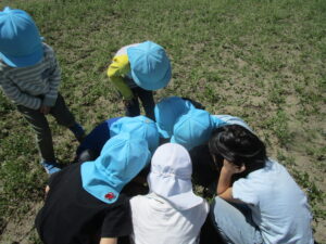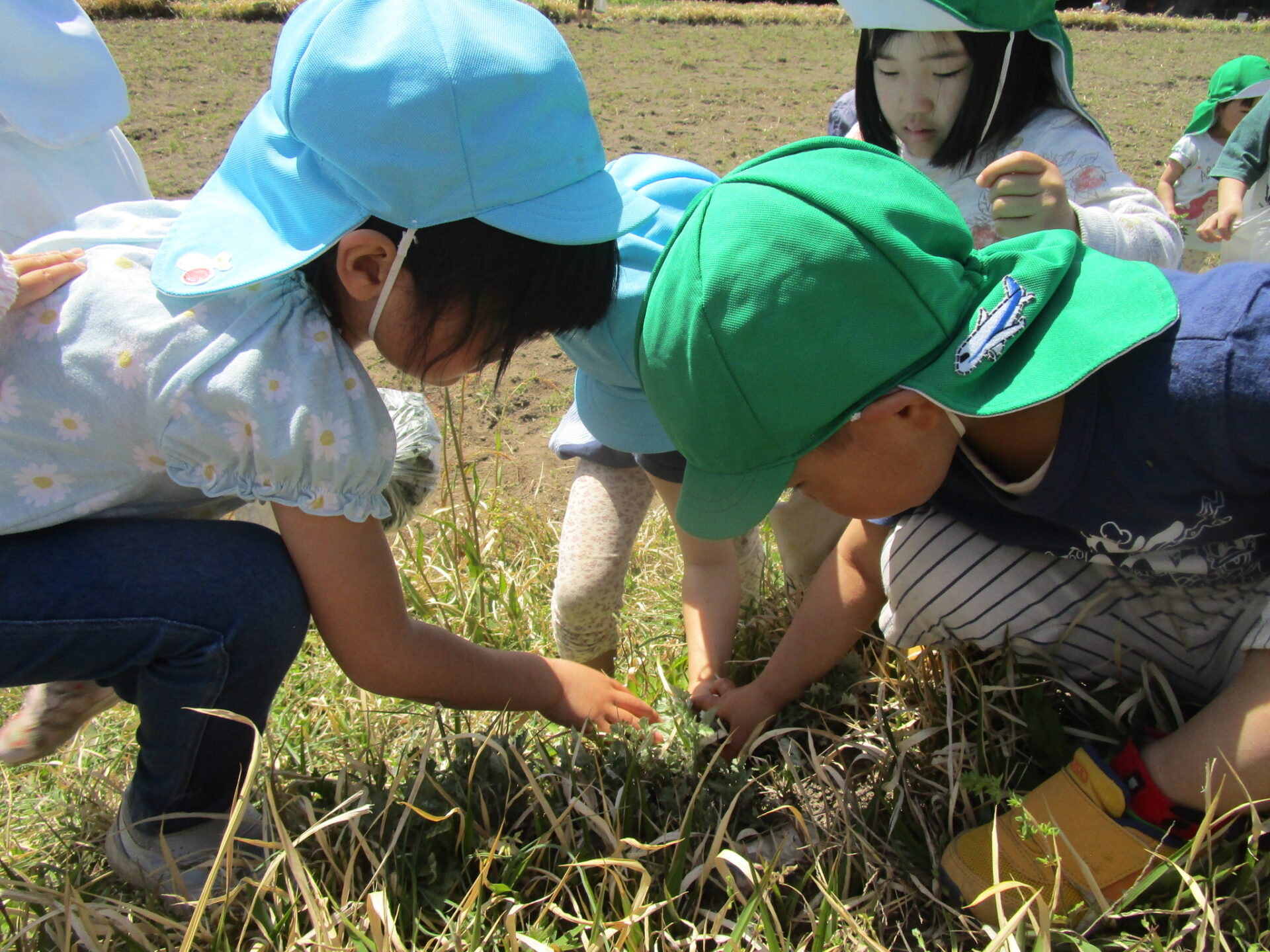 ・ヨモギ摘みは昨年の経験もあり、特徴も分かりやすく、こども達は楽しみながらたくさん摘むことができた。年長児が年中児に教えるような姿もあり、こども同士の関わりの場面も持てた。