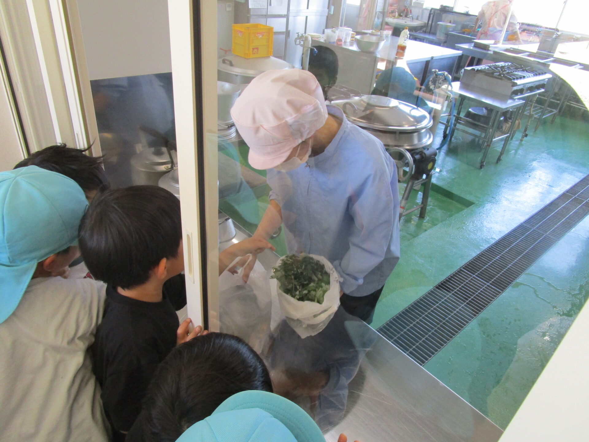 たくさん摘んだヨモギを給食先生のところへ持っていき「ヨモギのホットケーキお願いします。」