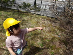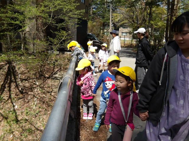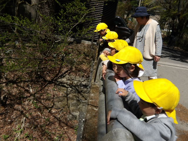 軽井沢に遅い春がやってきました。桜もきれいに咲き、春探しに行きました。小さい花が咲いている様子に気付く子や大人の目では気が付かなかった高い所に生えていたつくしを見つけた子もいました。