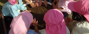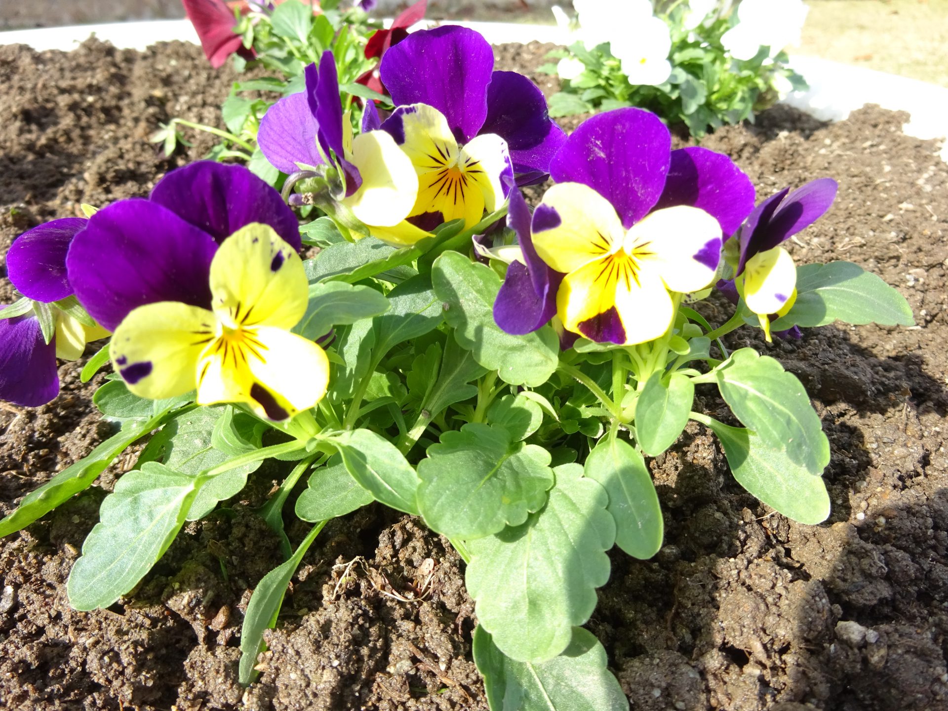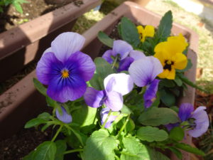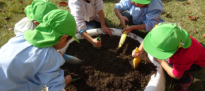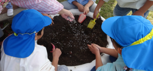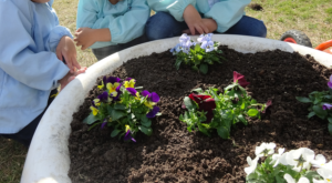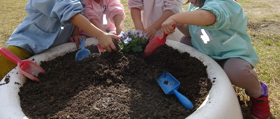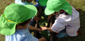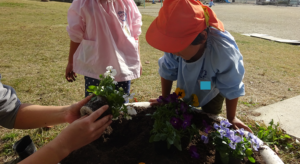 春から夏にかけて咲いていた花が枯れてしまいました。お水を上げたりして育てたけど残念。「ご苦労様」今度は、寒い季節でもたくましく咲く花に関心を持ってもらいたくて花植えをお願いしました。保護者の中でお花屋さんにお勤めしている方がいるので育て方のアドバイスや花摘みの仕方を教えてもらえます。みんなで植物に触れていることが楽しいです。