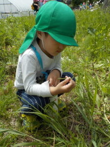 ・「捕まえる」「採る」という活動は、子ども達にとって魅力的な活動である。自分の興味持った生き物や草花を自由に捕ったり採ったりでき、満足感が感じられたと思う。また、そこから「何で?」「これはこうだ!」と疑問などの様々な思いが広がっている。子ども達のそんな気づきや思いを大事にしたいと思います。