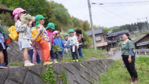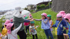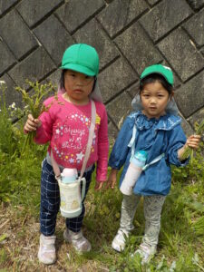 ・帰り道に川路神社の石段を通った時があり、その時から子ども達は「ここを通ろうよ!」と提案します。初めての時は「疲れた」「足が壊れる」という声が多かったのですが、2回3回と子ども達のリクエストで登ると、登るペースが速くなり「神社で遊んでいこう」という余裕が出たり、最後尾を行く保育士を「頑張れー」と応援してくれるようになりました。子ども達の脚力がこの数回で変化している事を感じました。