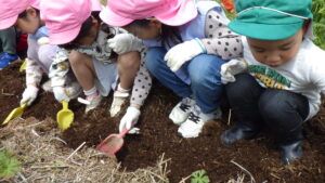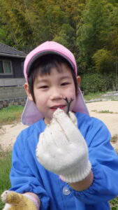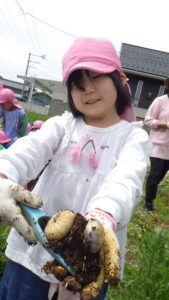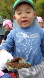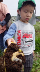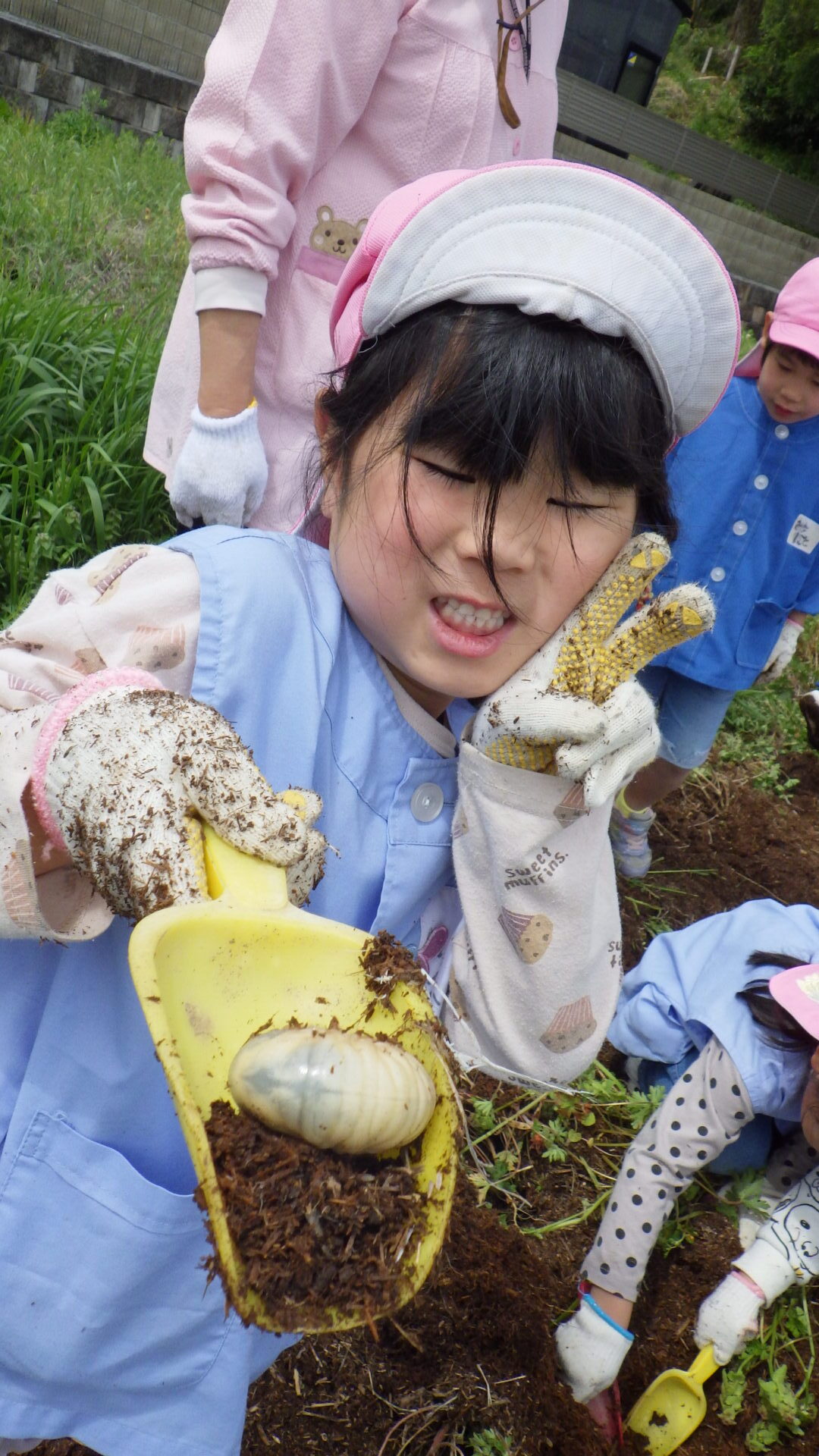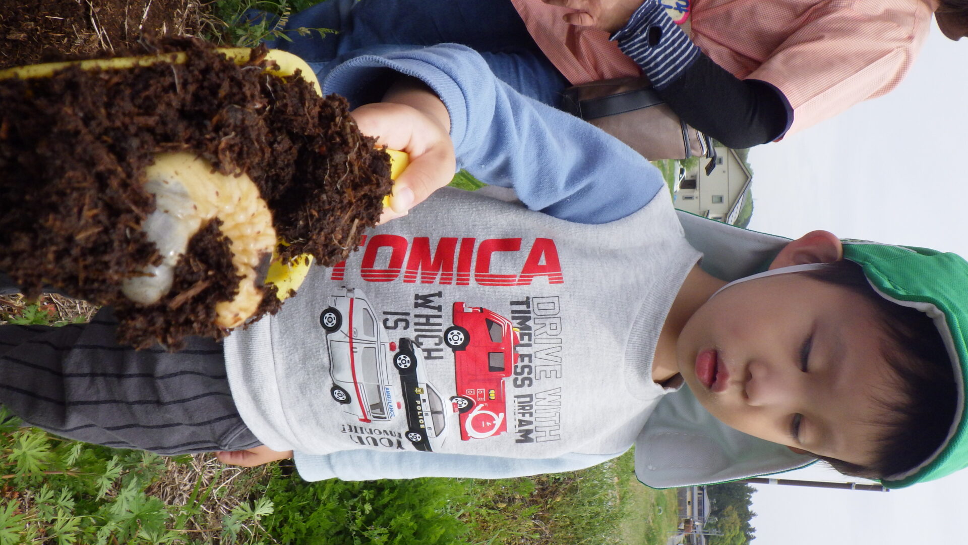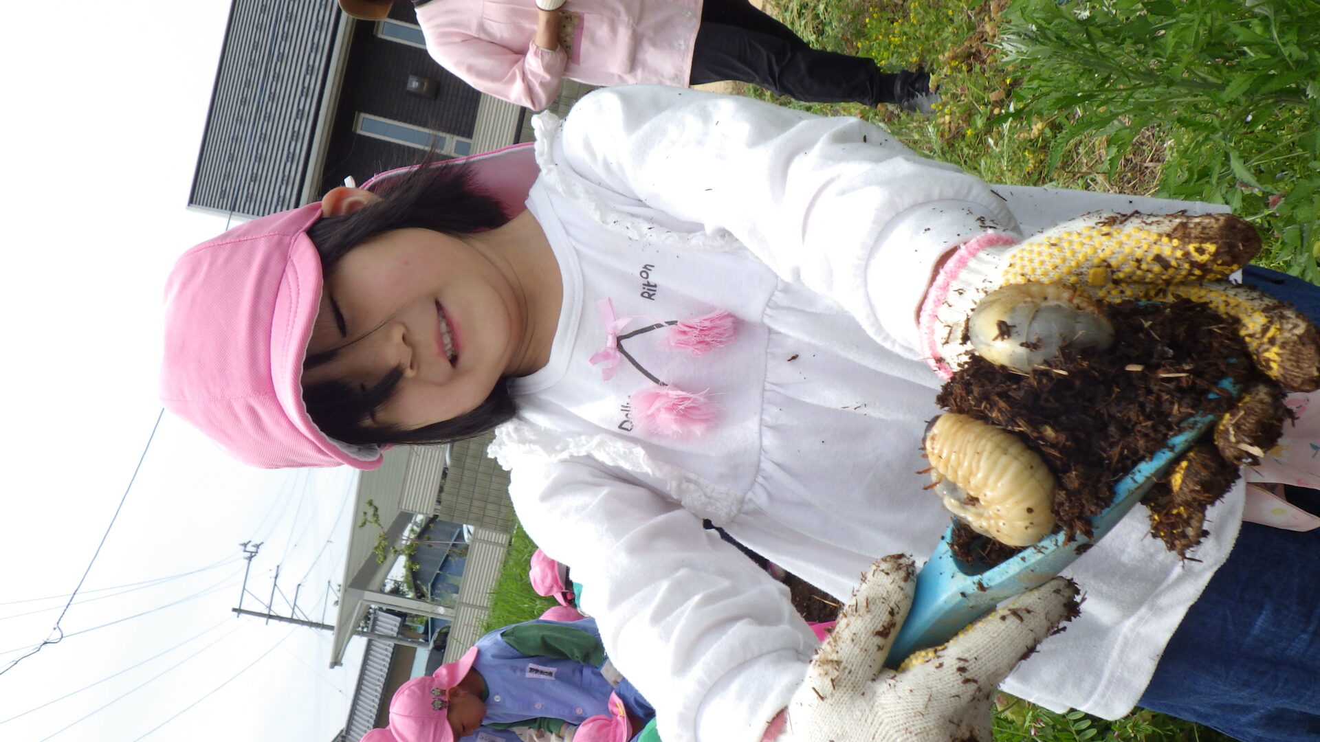 ・虫が苦手なお友だちもいます。しかし、今年は「ちょっとなら・・・」と自らシャベルを持って幼虫を捕っていました。