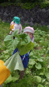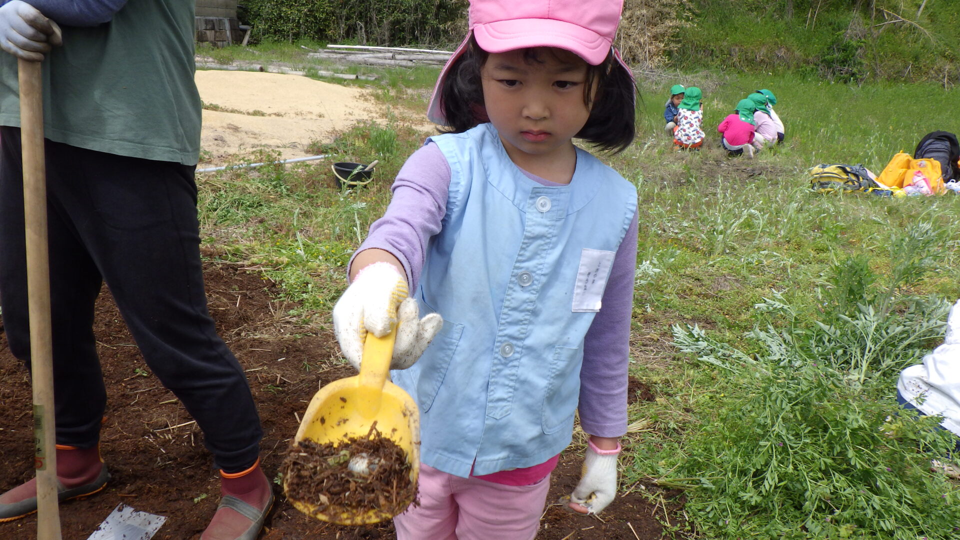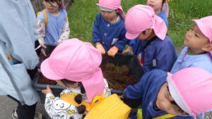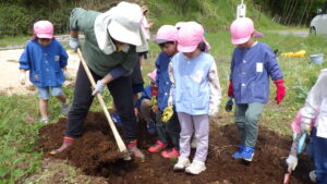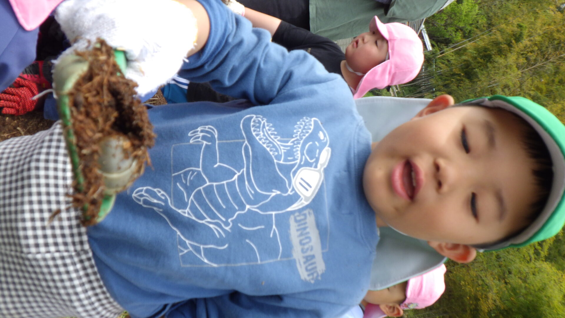 田んぼ作りでお世話になっている地域の方が、今年も「カブトムシの幼虫がおるぞ~、捕りにおいなあ」とお声がけをしてくださったので、年中年長で出掛けました。