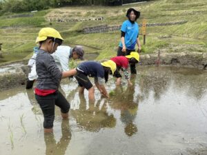田んぼに足を踏み入れると「ぬるぬるしてる」「下は固いね、何があるの」などと気づいたことを口にする子供たちです。保全会の方から苗の植え方を教えてもらいながら「苗は三本をまとめて植えるんだね」と数を数えながら慎重に植えていました。