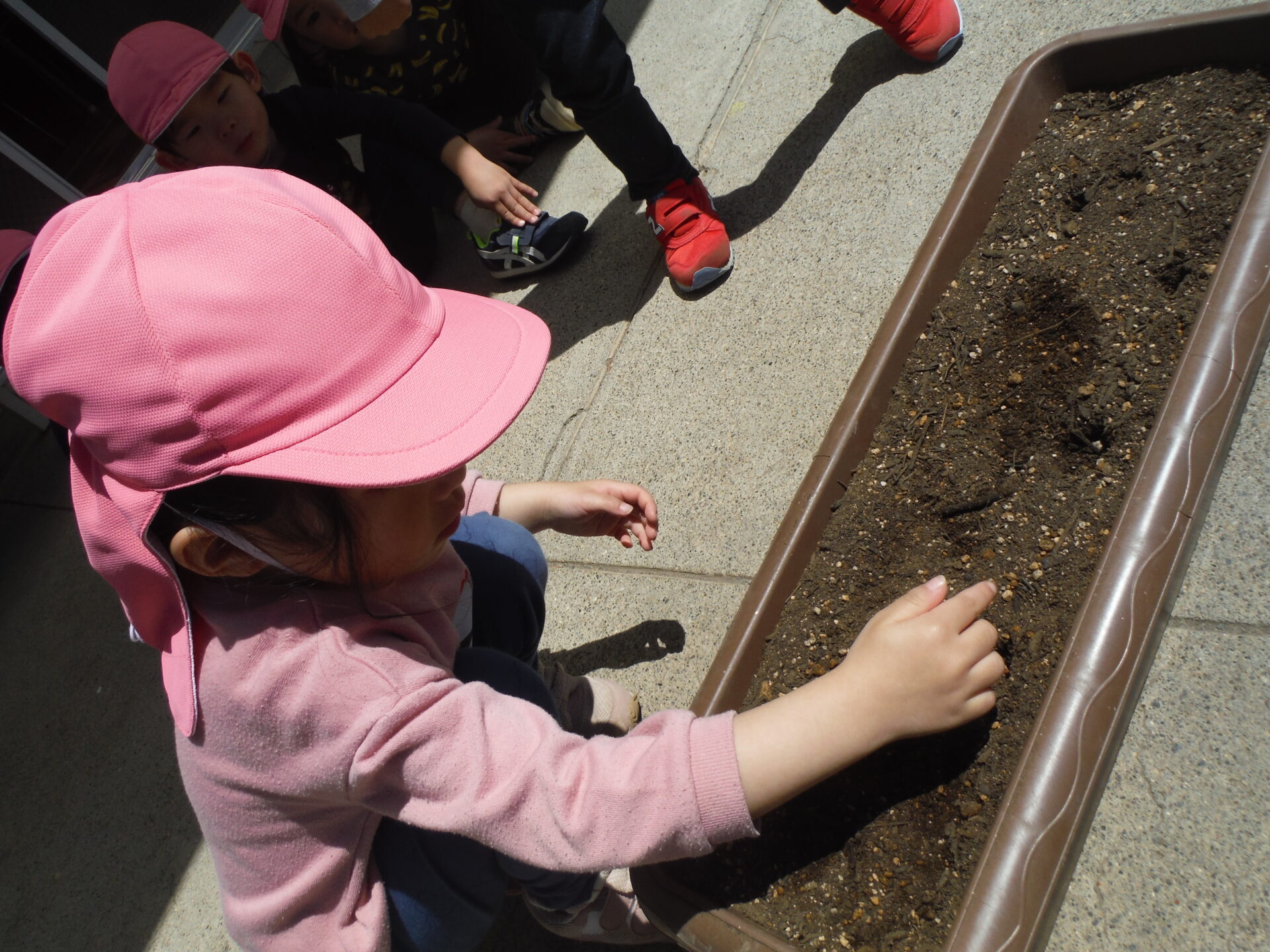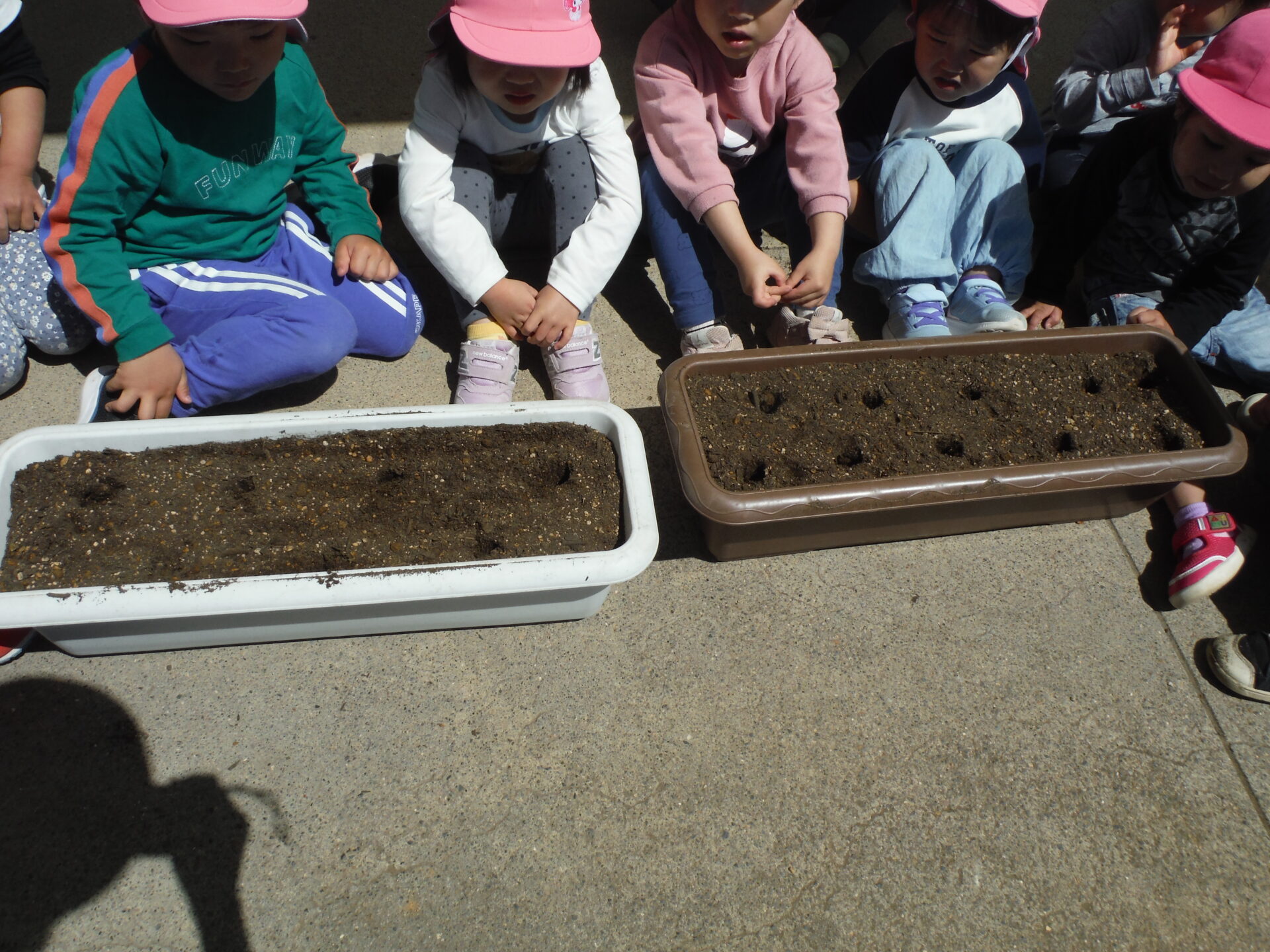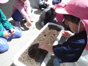 ・二十日大根は種が小さく、こぼれ落ちてしまうこともありましたが、地面をじっとみて、種に気づいて拾う姿がありました。
