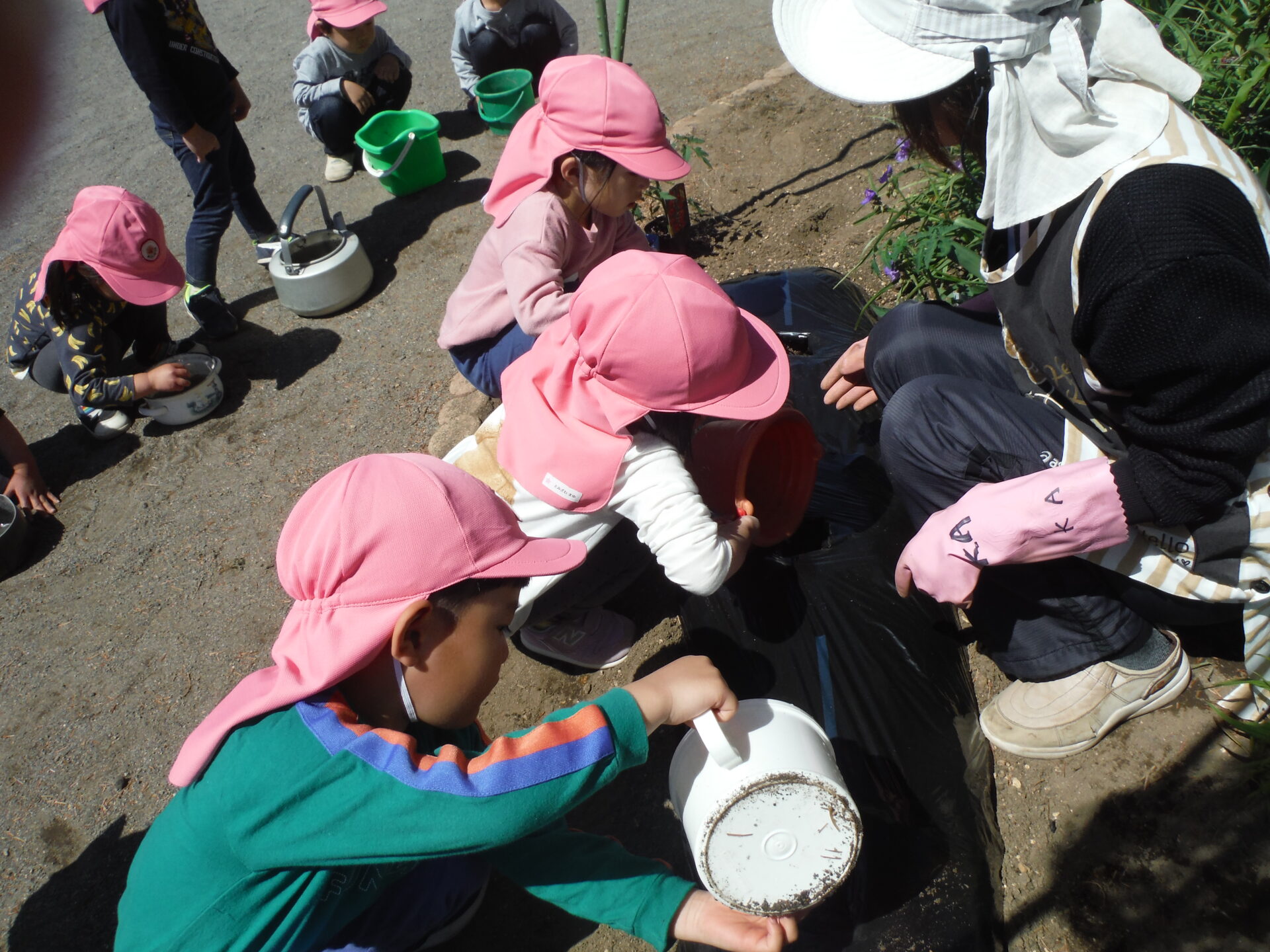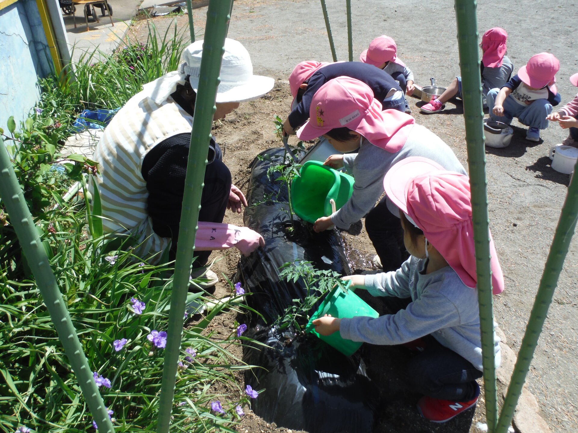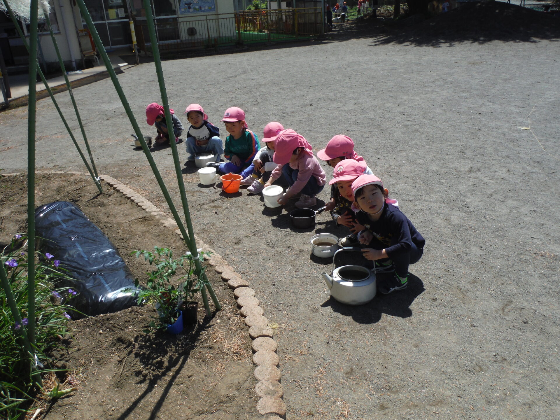 まずは、トマトの苗を植えます。子ども達もお手伝い!それぞれ思い思いの入れ物に水を汲んできました。