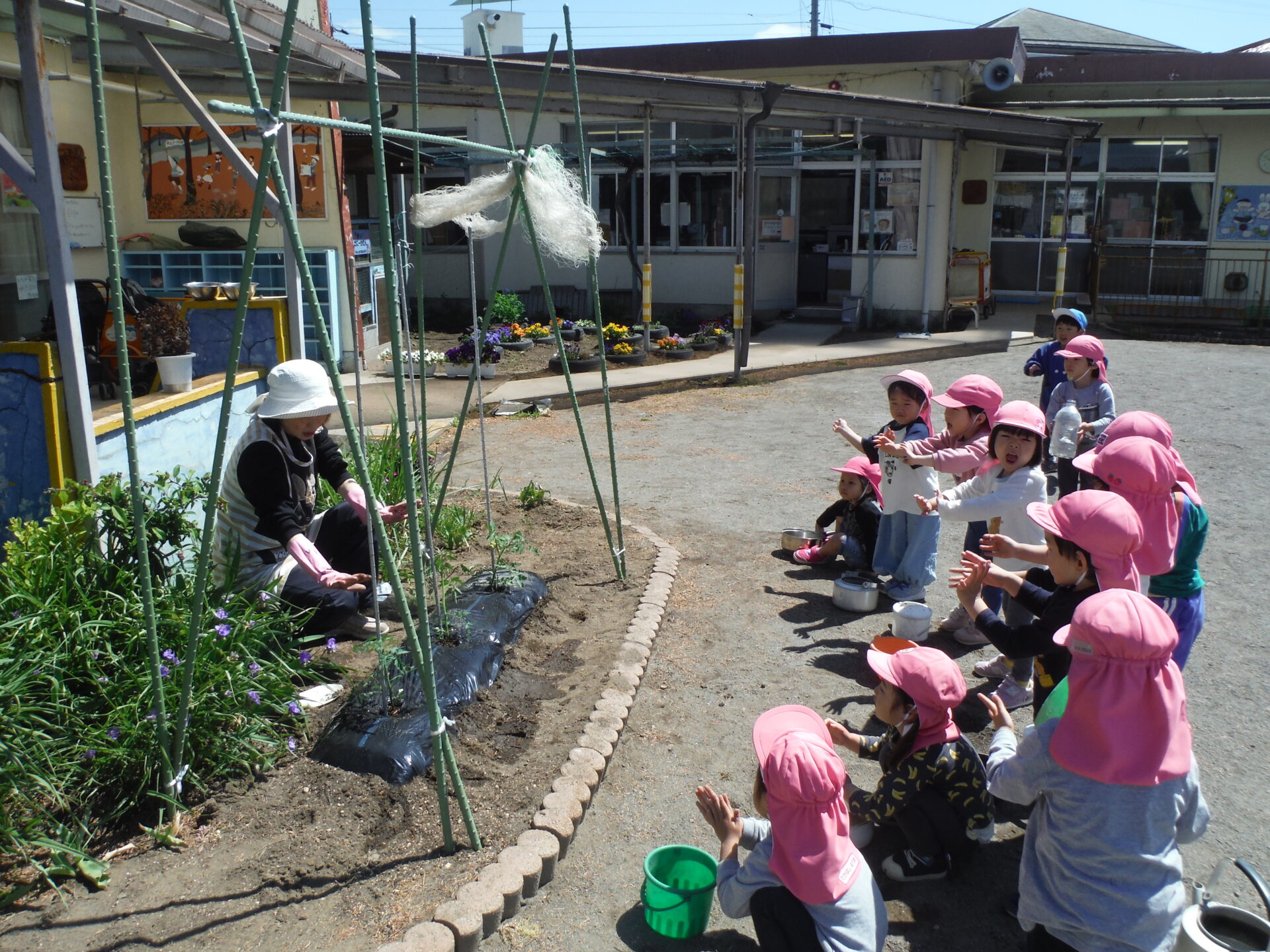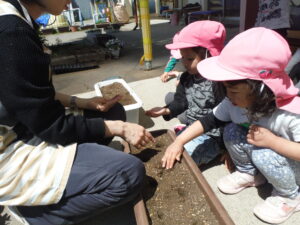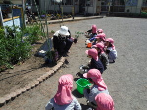 年少さんで、保育室近くにトマトの苗を植えたりプランターに二十日大根の種を撒いたりしました。