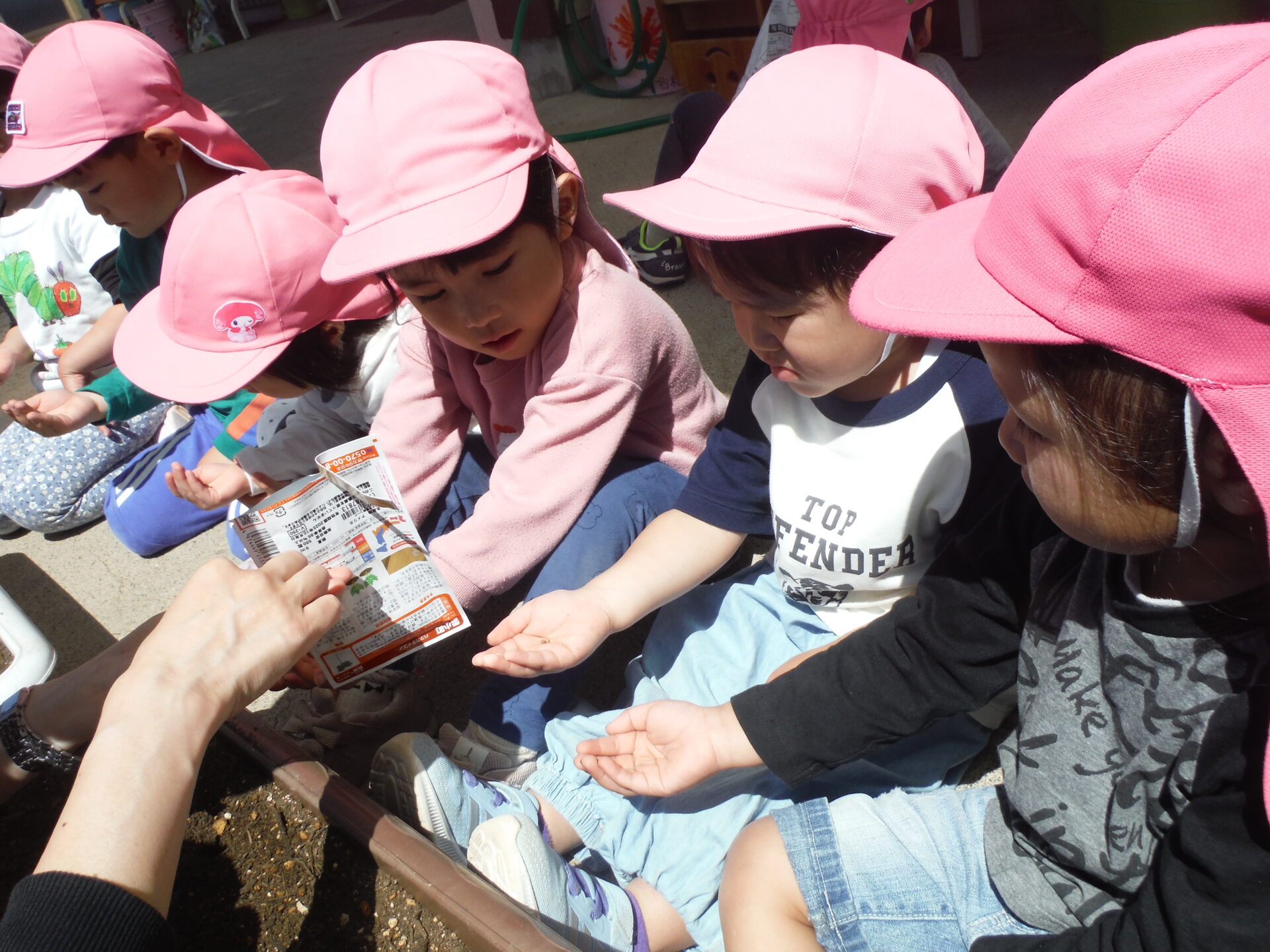「大根を撒くんだよ。これが二十日大根の種だよ。とっても小さいね。」「手をお皿にして、落とさなようにね」と一人一人種を大事そうに配ってもらうともっていました。