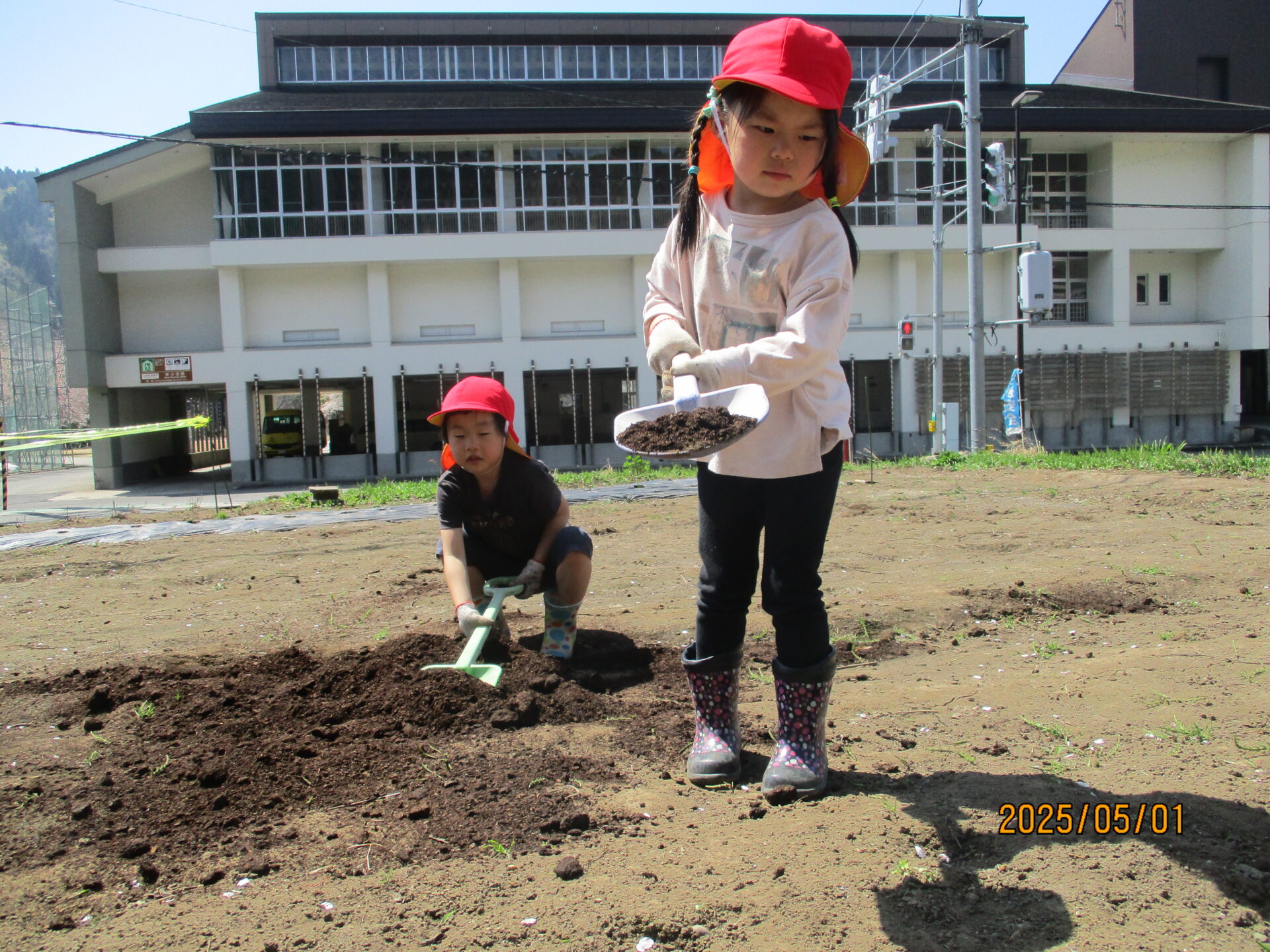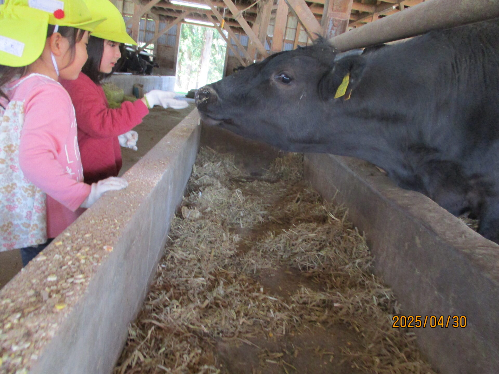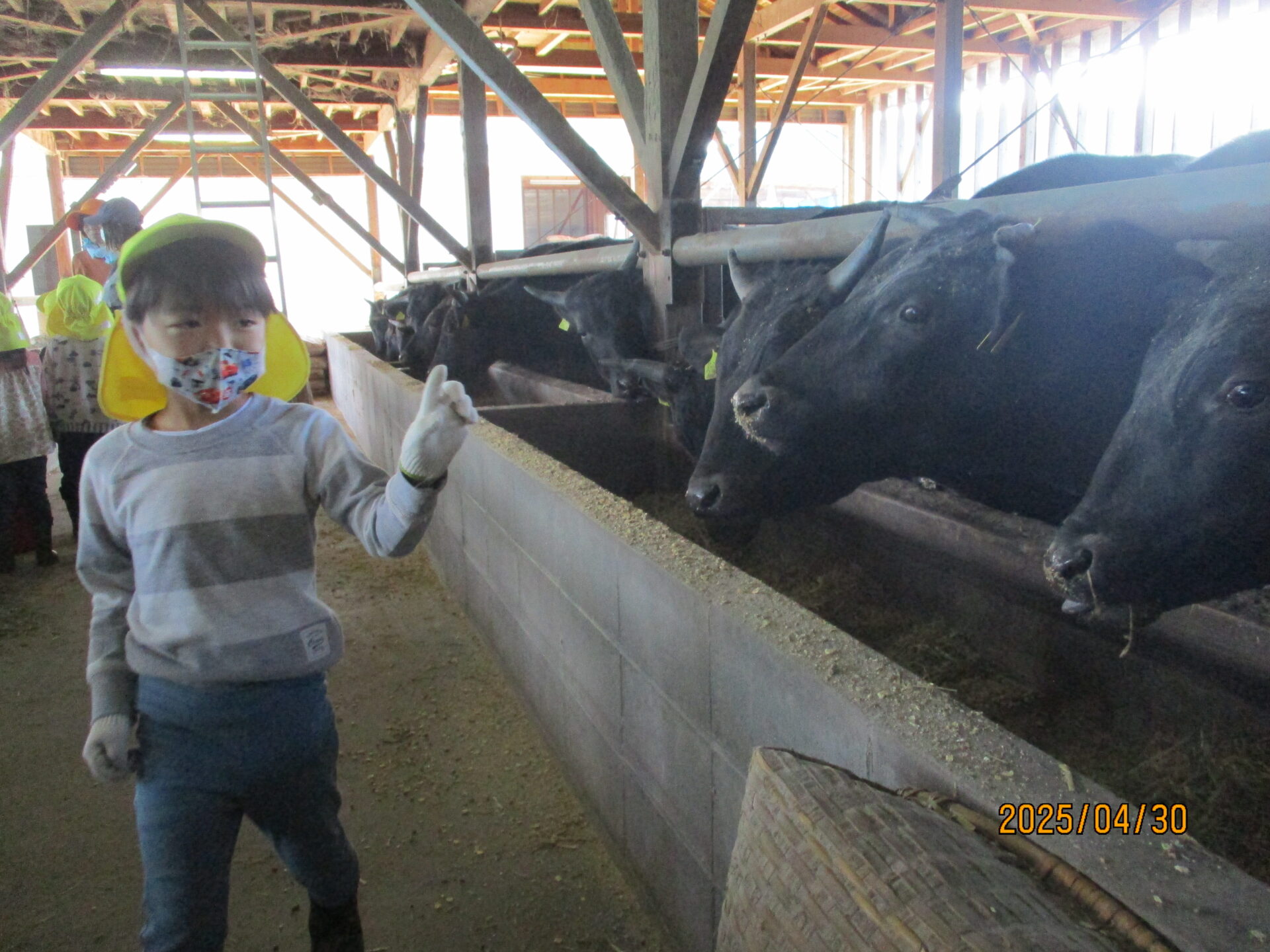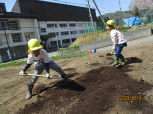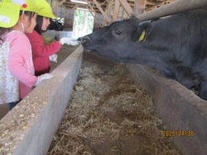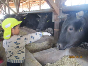 年長さんになると、村の畜産農家「みゆきファームひぐち」さんの牛舎に行き、堆肥をもらってきます。でも、「堆肥って!?」 そこで、初めて堆肥が「牛のうんち」だと知る子ども達。「くっせー」「こわいな」と初めはしり込みします。でも、あっという間に慣れました。