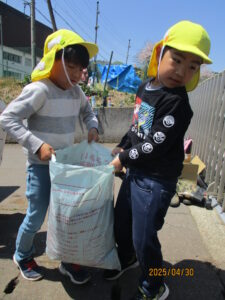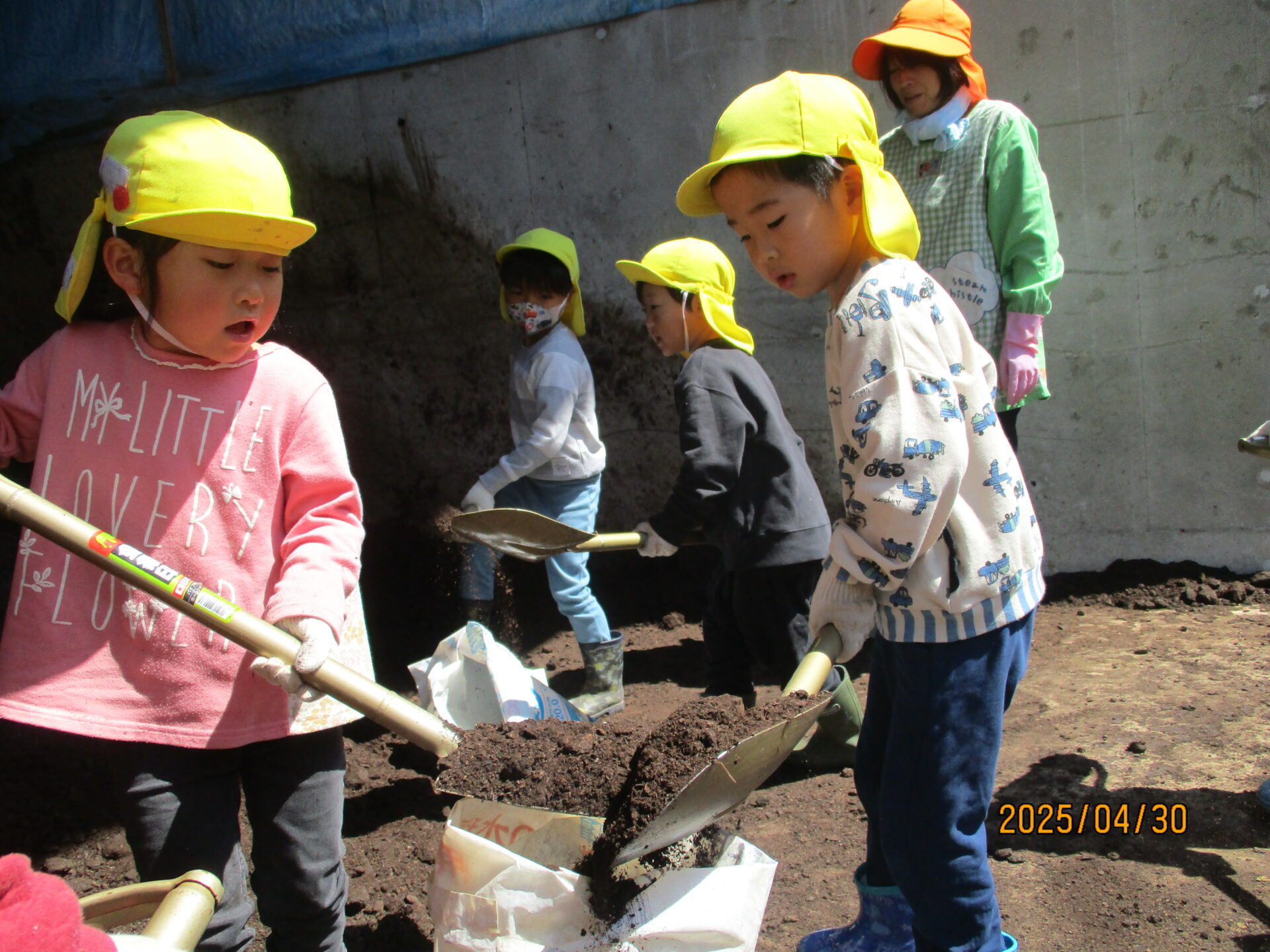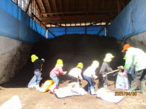 「うんちは臭かったのに、堆肥は臭くないね。」「あったかいよ!なんで?」と、初めての体験に子ども達もびっくり。それぞれスコップで袋に沢山詰めてくれました。それを協力