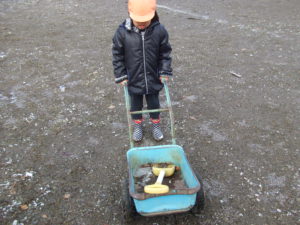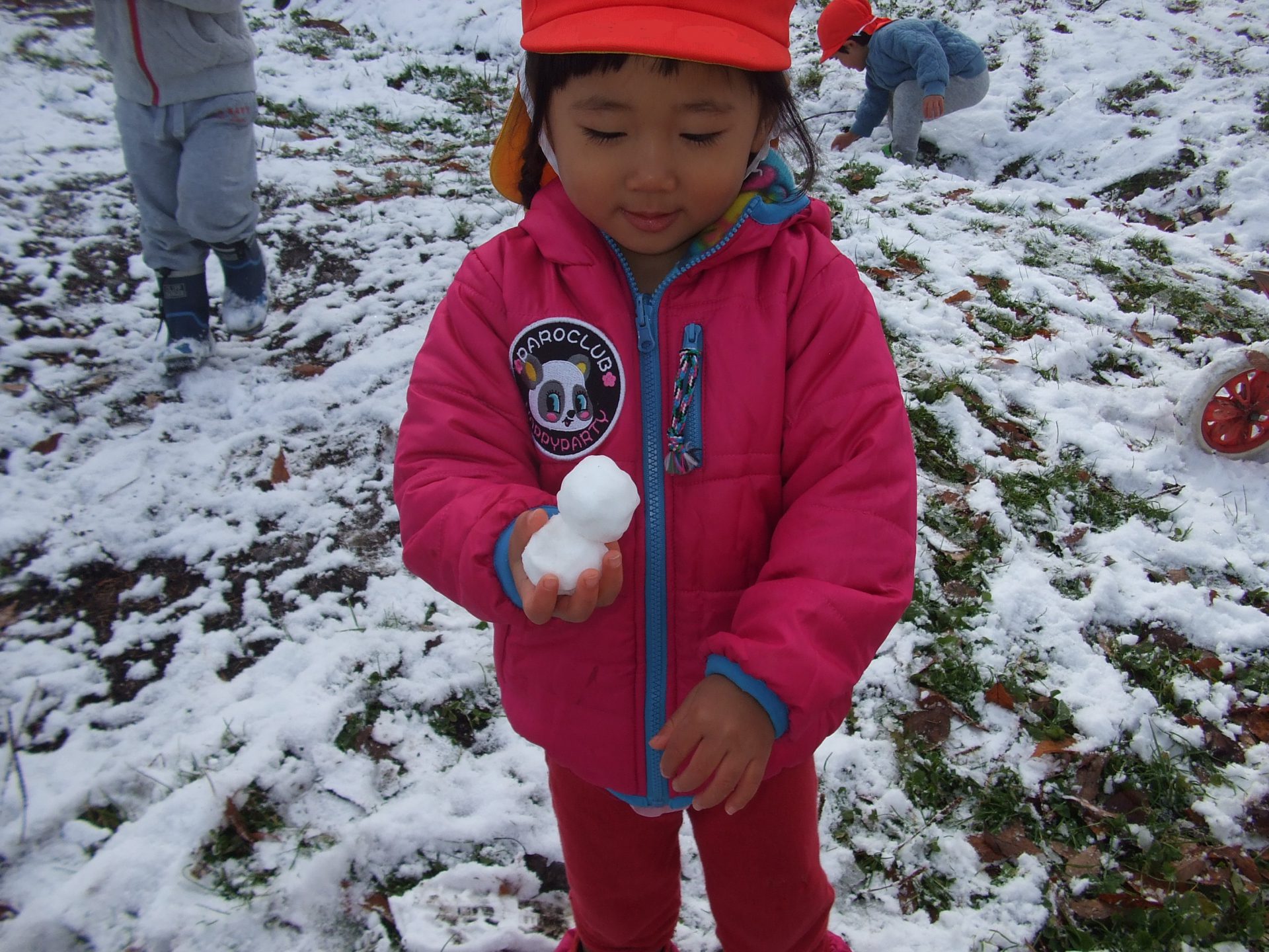 「雪」と言うワードからごっこ遊びが発展し、イメージをしながら遊べるようになってきていることに成長を感じました。雪遊びの場面では、まだ自分の気持ちを表現する言葉を多く持っていない子ども達ですが、きっと頭の中ではいろいろな思いを巡らしているんだろうなと今回の姿を見る中で感じました。子ども達の様子から、どんなことが面白いのだろう、どんなことに興味を示しているのだろう、そんなことを考えていくと子ども達の世界に一歩足を踏み入れられるのではないかと思いました。これからの雪遊びがとても楽しみです。
