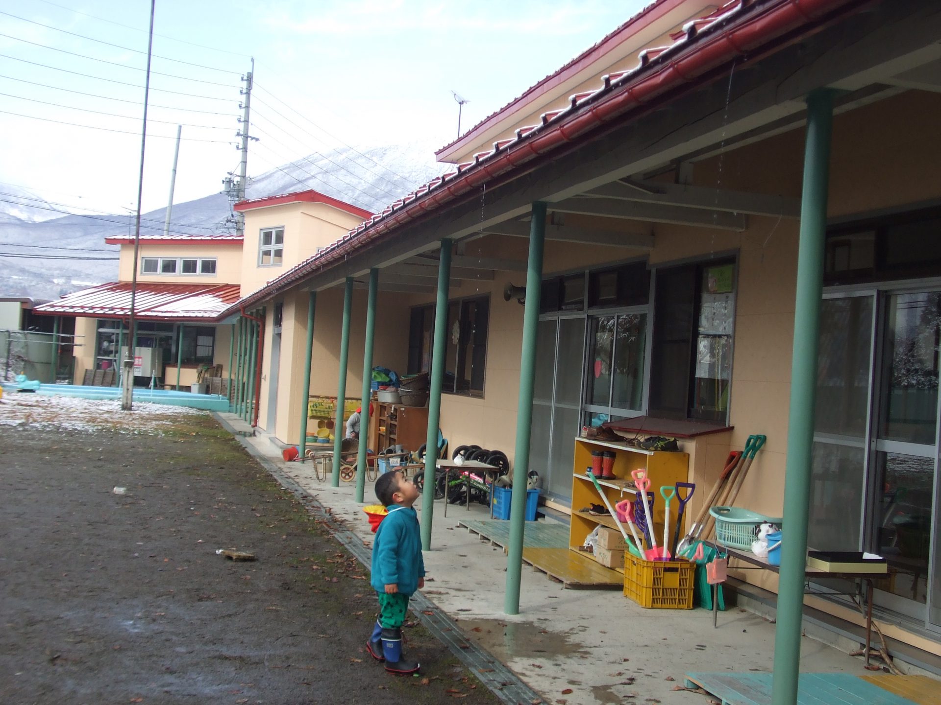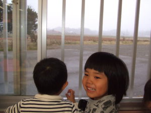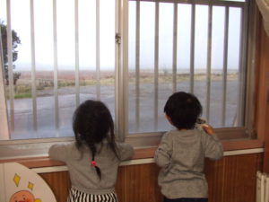 窓から外を見つめ、「雪ないねー。」という子ども達。