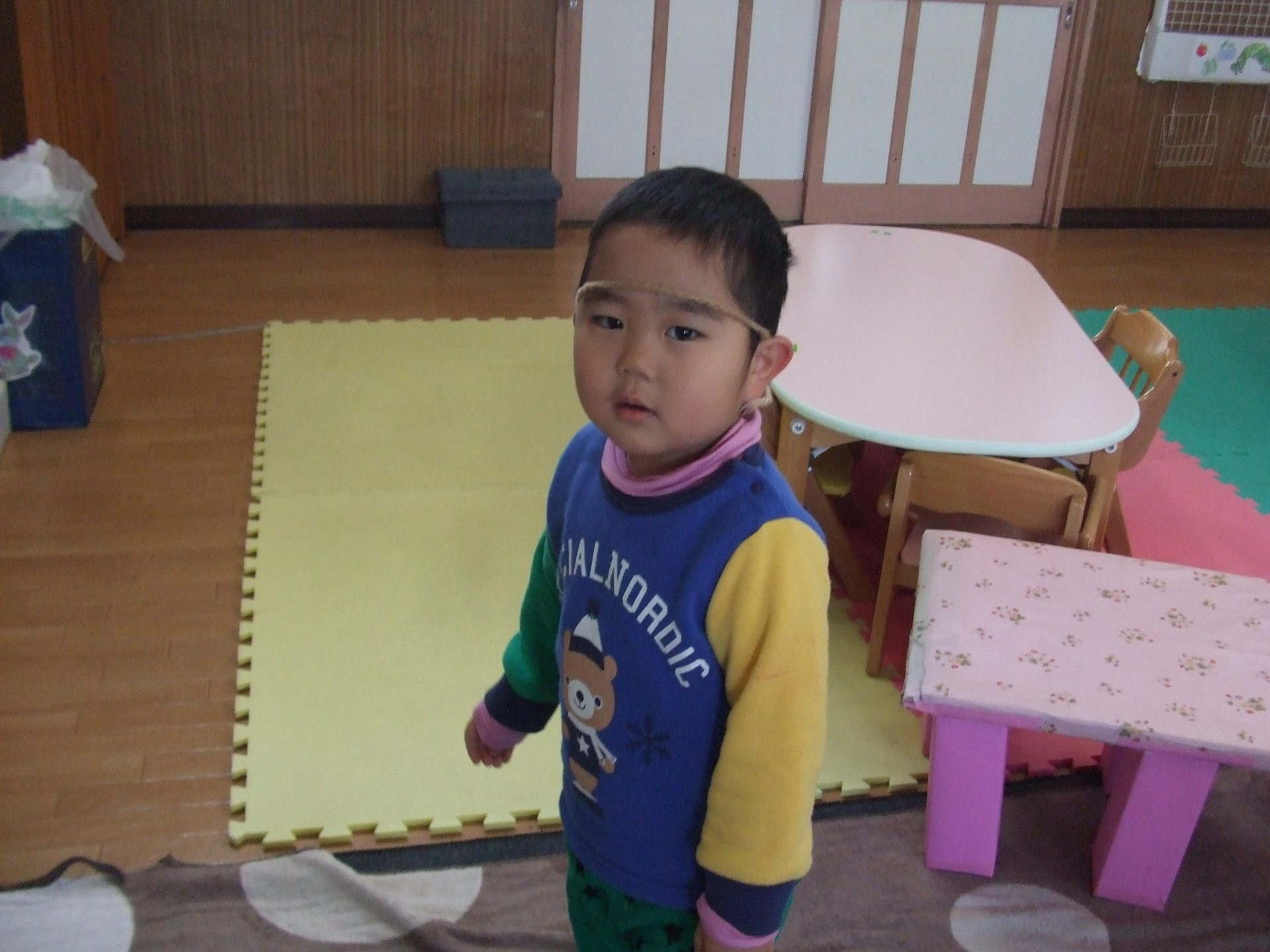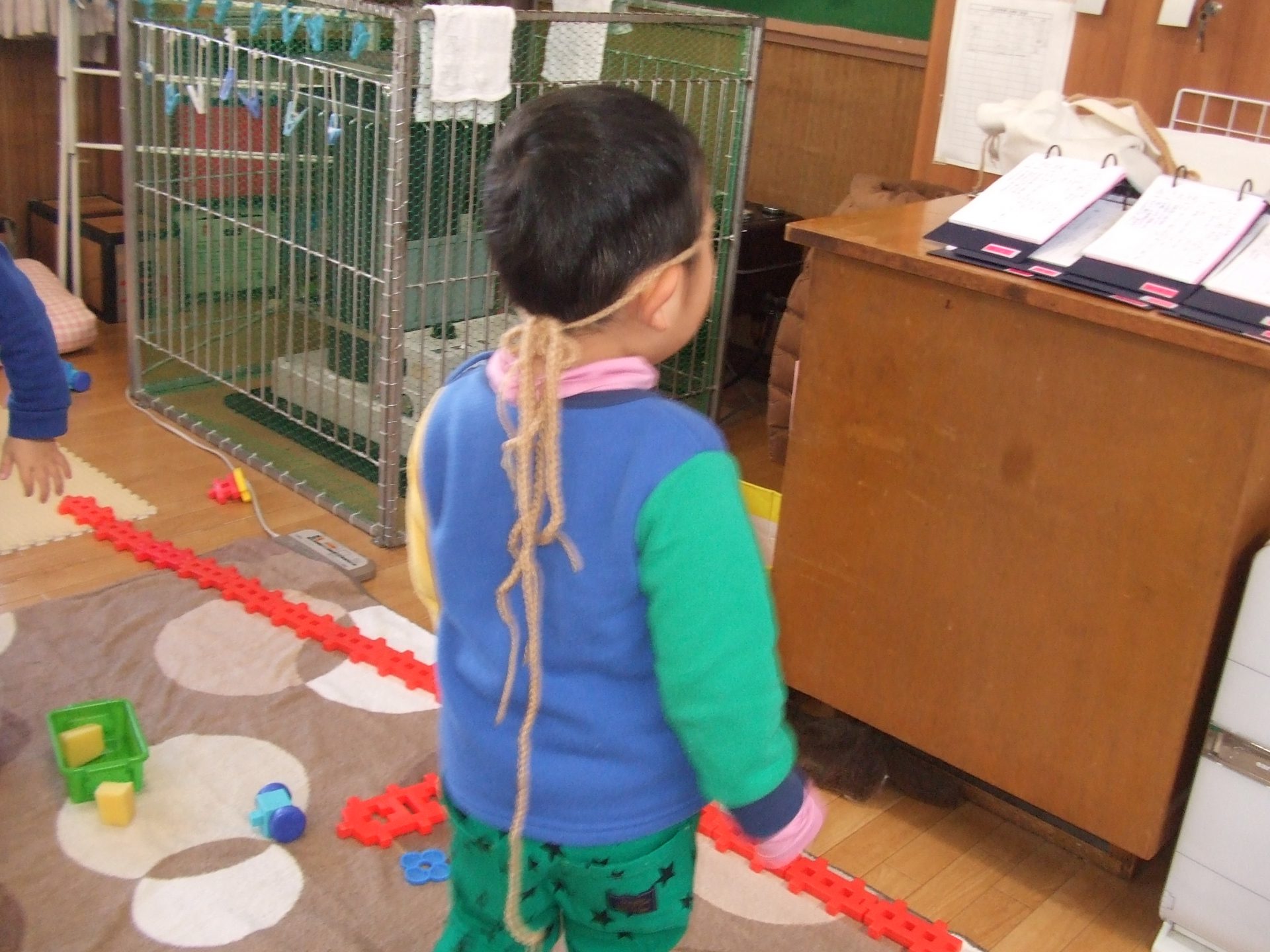 すると、「僕もアナになりたい!」と三つ編みが羨ましくなった男の子に、「これでもいいかな?」と毛糸を差しだすと、「うん!」と言って頭につけて髪の毛にして楽しんでいました。