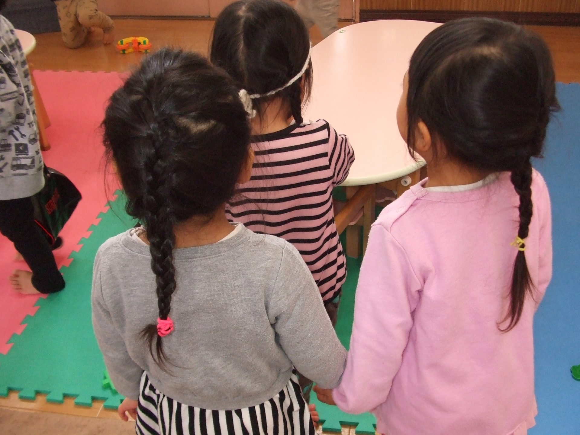遊んでいる中でもふと立ち止まってじーっと見つめたり、触って確かめたりする子ども達。言葉は少ないですが頭の中でいろいろな事を考えている様子が見られました。子ども達の様子から、大人は疑問に思わないところでも、子ども達にとっては不思議なことがたくさんあるのだと改めて感じました。