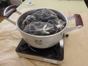 桜の枝をぐつぐつと煮出している様子を見て、匂いや色の変化を感じていました。