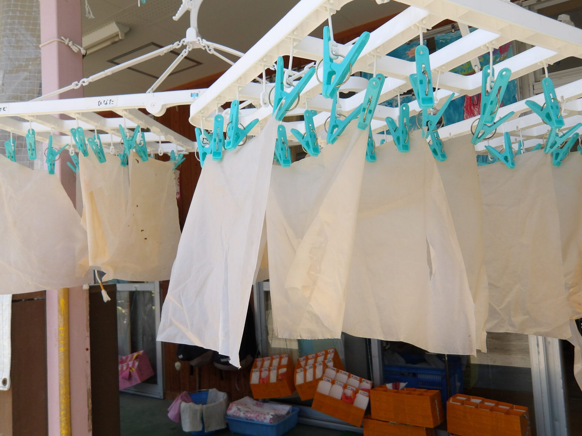 干した日は風があり、その風に乗ってふんわりと匂いが!「やっぱり桜餅だ!」「でも色はピンクじゃないね…」とがっかりする子もいました…