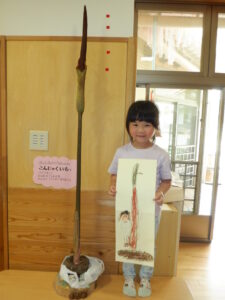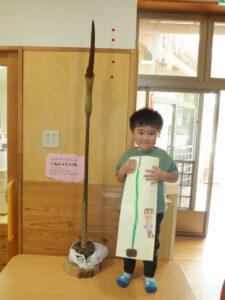 毎日観察をした事で、小さな変化にも気が付き、それぞれが感じた事を言葉にしたり、新しい角度から、思いや想像を膨らませ楽しむ事が出来ていた。実際に食す、こんにゃくとは、なかなか結びつかない為、調理過程など見れる機会があればもっと興味の範囲が広がると感じた。