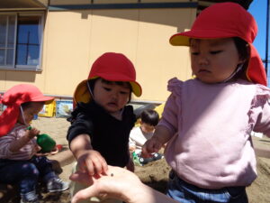 保育士が触る様子を見て、自分から手を伸ばす姿もありました。