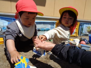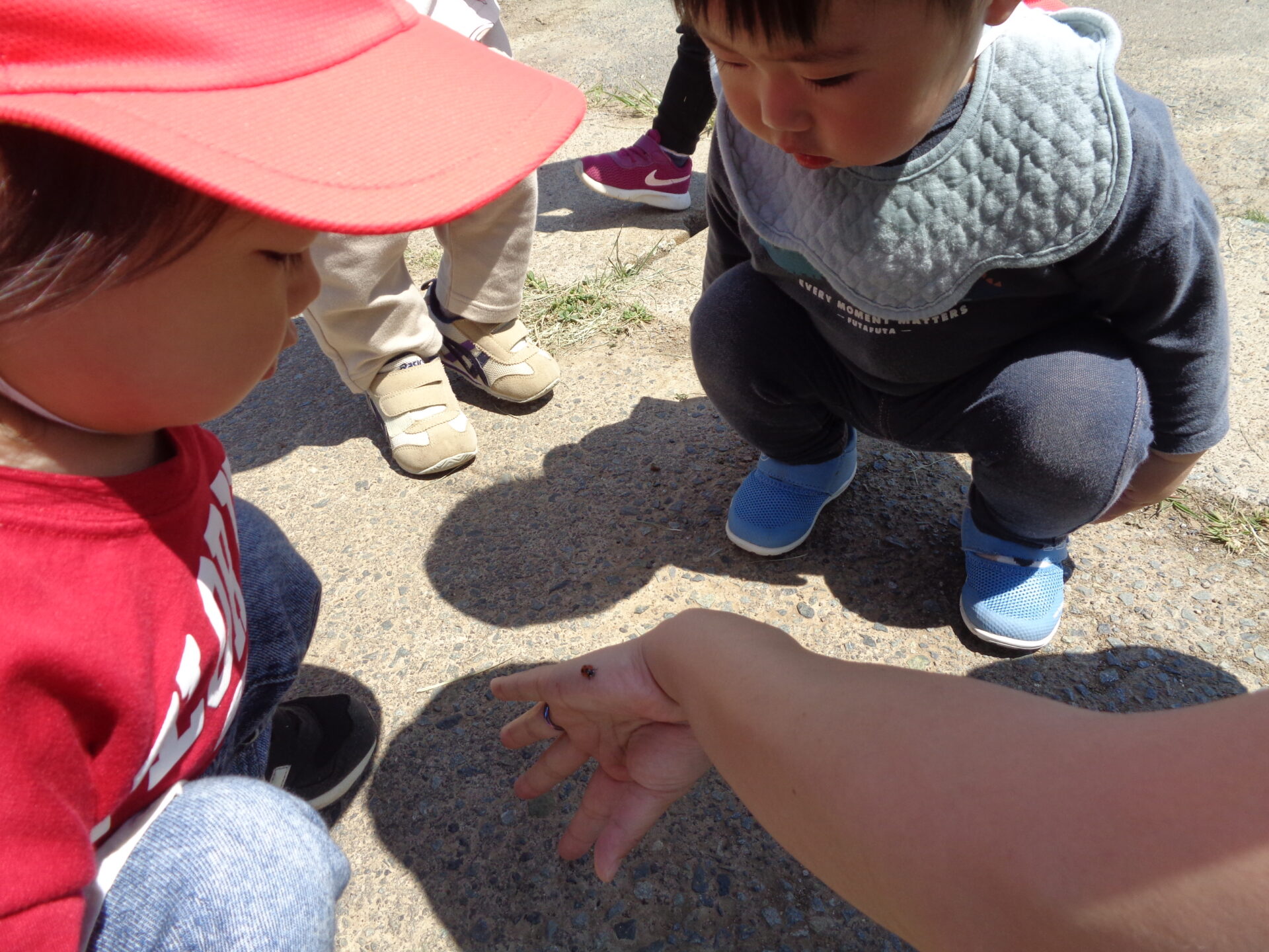 テントウムシを発見。「テントウムシだよ。赤いね。」と保育士が言うと「あか!」と嬉しそうに見ていました。
