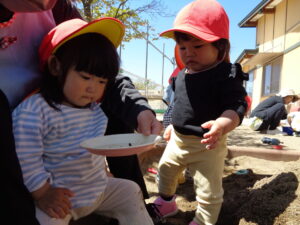 「ダンゴムシいたよ~!」と保育士が器に捕まえると、子どもたちが集まってきました。
