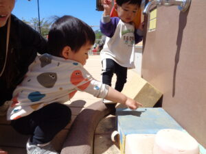 葉っぱや砂や石をあげようとする子の姿もあり、食べさせてお世話をしたいようでした。