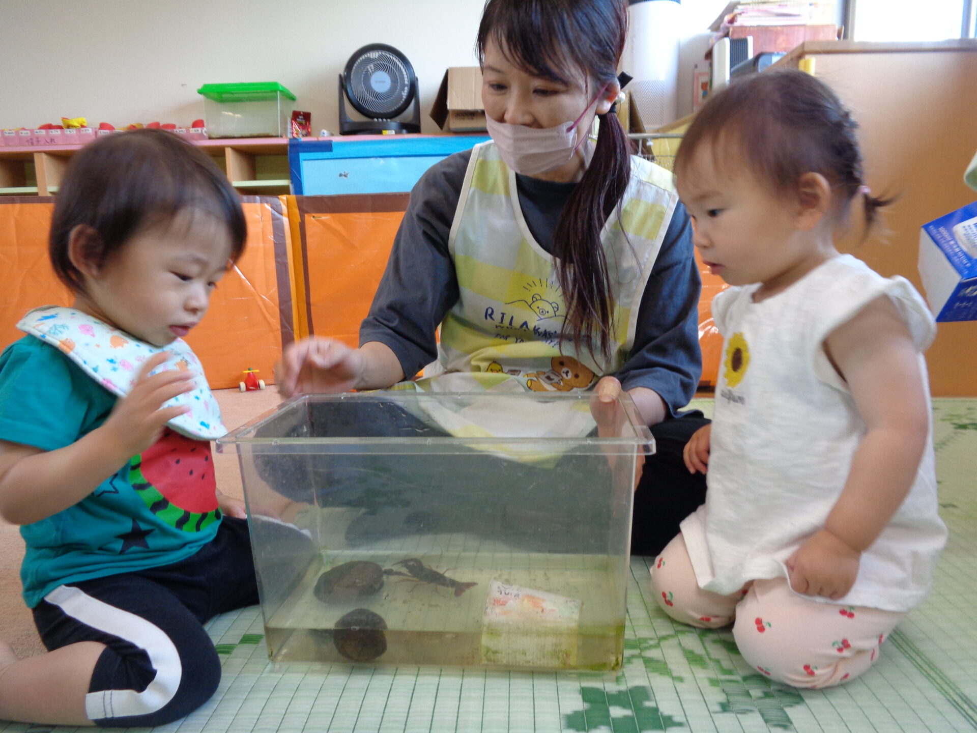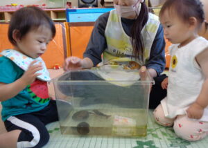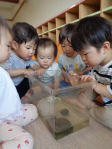 また、初めて見る生き物は「ちょっと怖いな……」と抵抗のある子もいますが、保育士が積極的に触れてかわいがる姿を見せる中で、少しずつ興味を持てると良いなと思います。