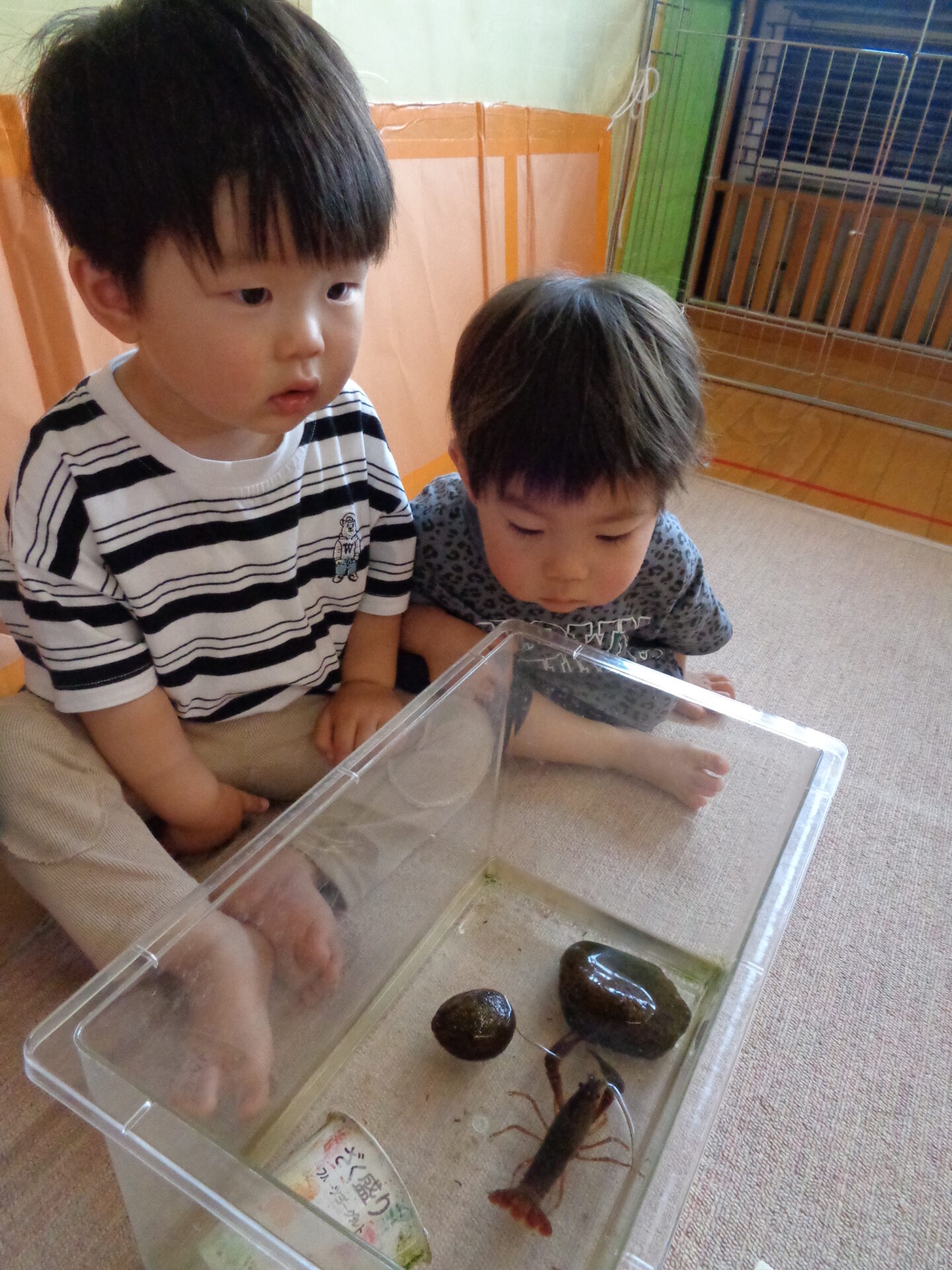 「動いた!」「チョキ!」と言いながらいつも囲んで見ていて、ザリガニ大好きな子どもたちです。