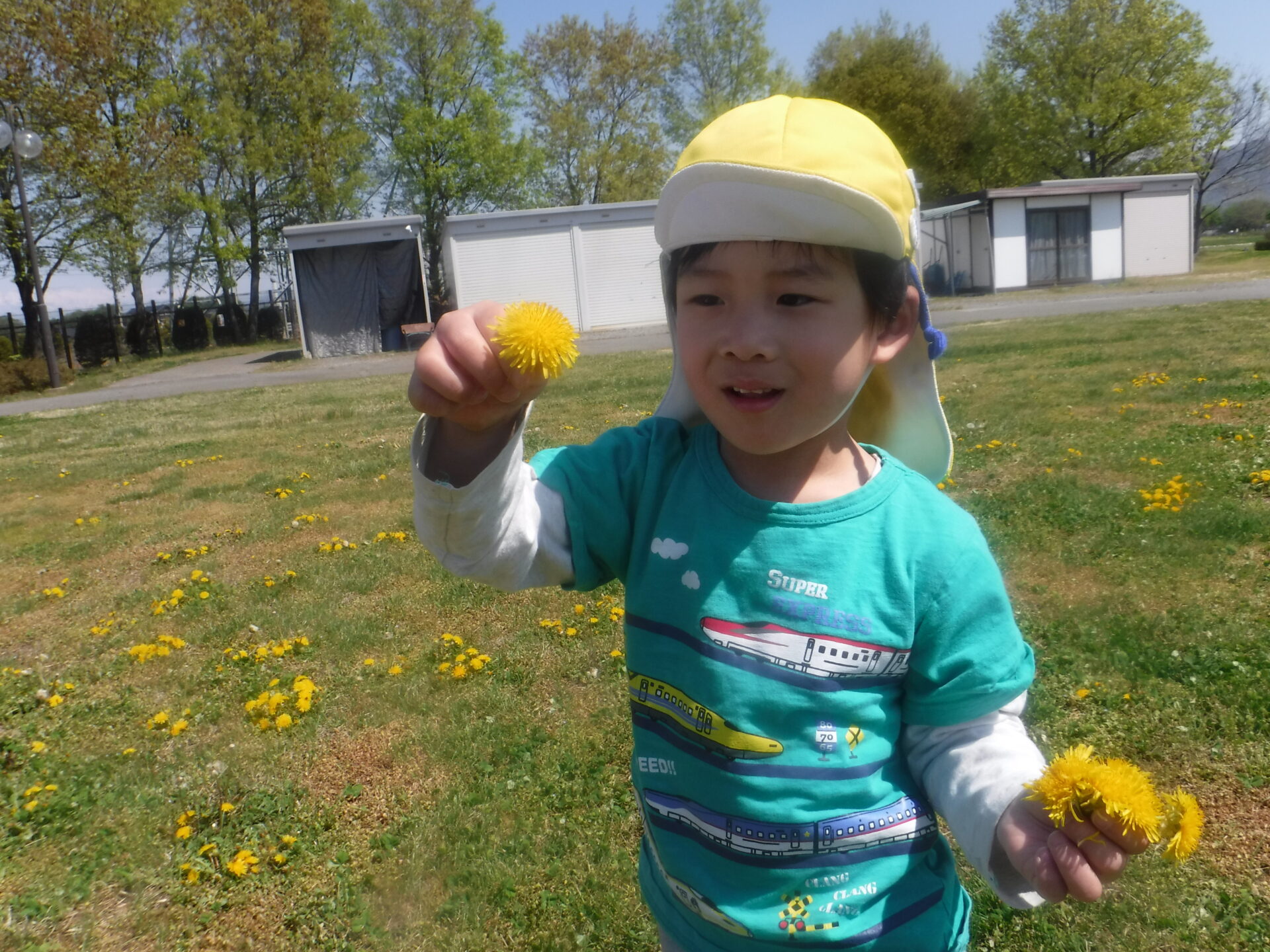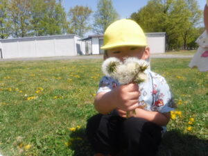 こども園のお庭にも、たくさん たんぽぽがあるよ。「これ、おかあさんのおみやげだよ。」