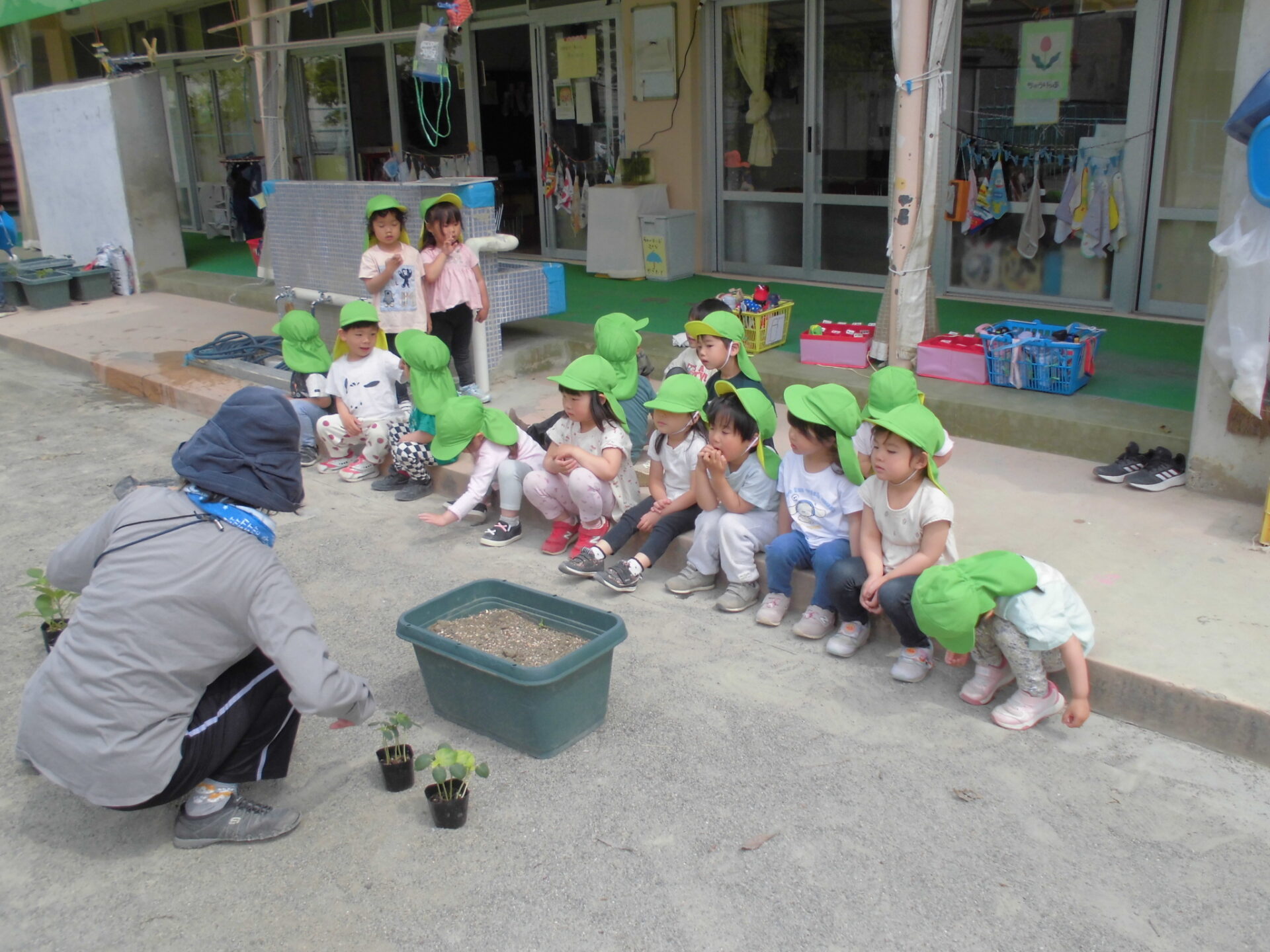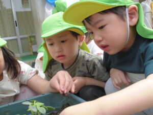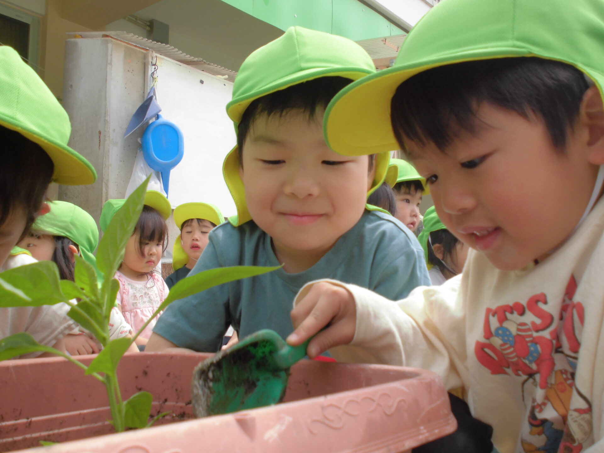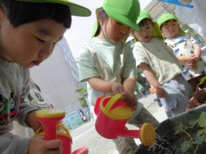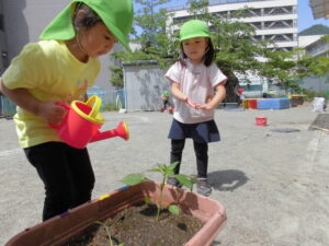給食の時「お野菜をもっと減らして!」「食べられない」と野菜だけ残し苦手な子もいる。自分たちで育てた野菜の世話や観察をする中で生長を楽しみにし、食への興味、関心につながればと願っています。