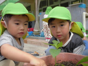 ちゅうりっぷ組で苗を植えるのは2つの野菜。苗をみると子どもたちから「きゅうり?」「とまとだ!」「いちご!」いろんな名前がでてきました。プランターに穴を掘って、苗を入れて、保育士と一緒に手で土をかけました。