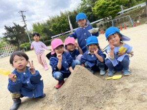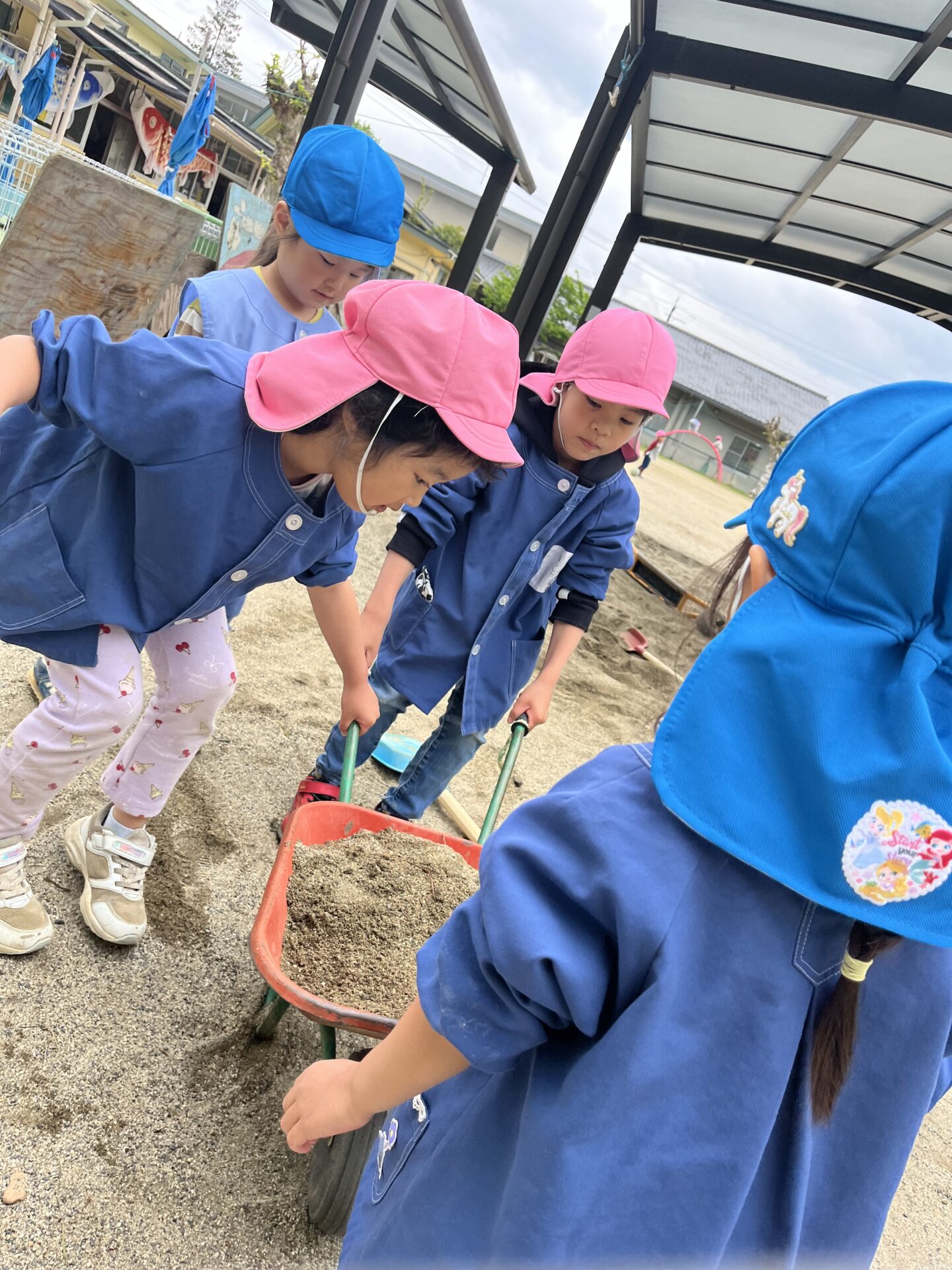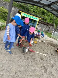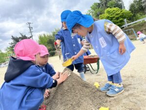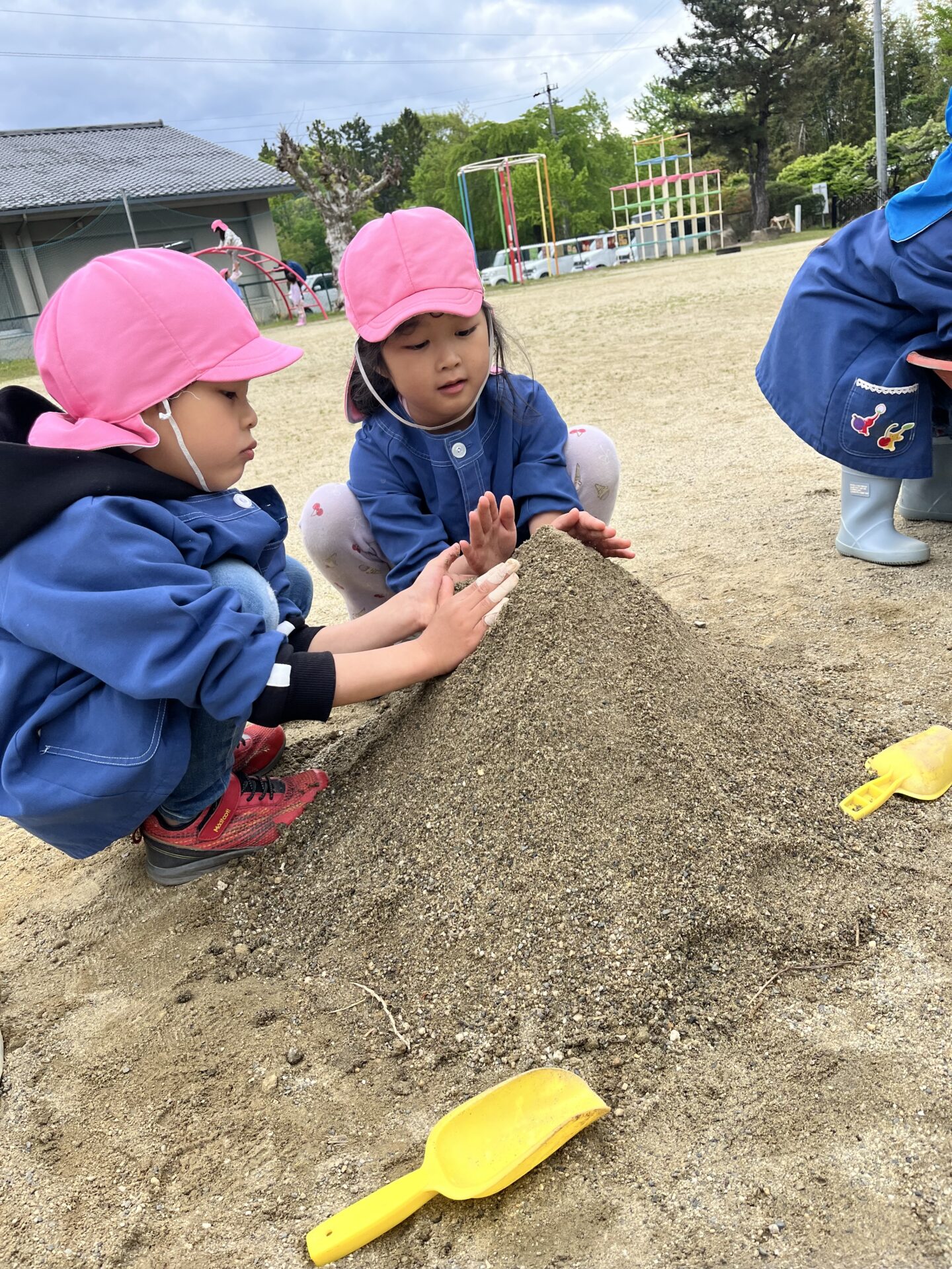 年長さんが入ってくれ、役割分担をしてくれました。何度も砂を運び、どんどん高くなっていく山に年少さんは大喜び!「あの木よりも高くしたいんだよ!」「えー?!それじゃあ富士山じゃん!」会話も弾みます。