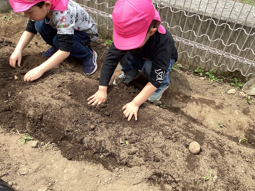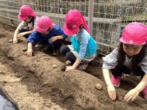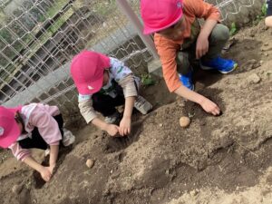 4月の下旬になり、年長児でジャガイモの種イモをまくことになりました。