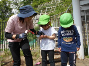 苗を植えた後の質問タイムでは、優しく教えてくれた地域の方に親しみをもち、子ども達から自然と「教えてくれてありがとう」と伝える姿がありました。