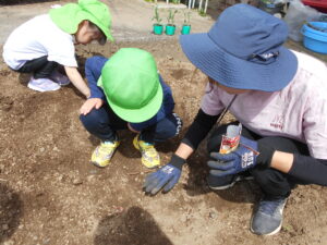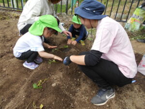 地域の方は、「土はそっとかけるんだよ」「(さつまいもは)寝かせてあげるといいね」と話しながら、