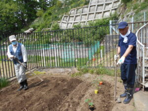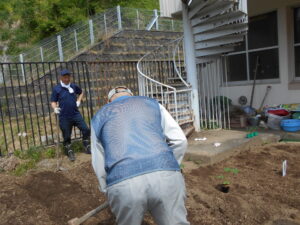 地域の方にお手伝いをいただき、畑に野菜や花を植えました。