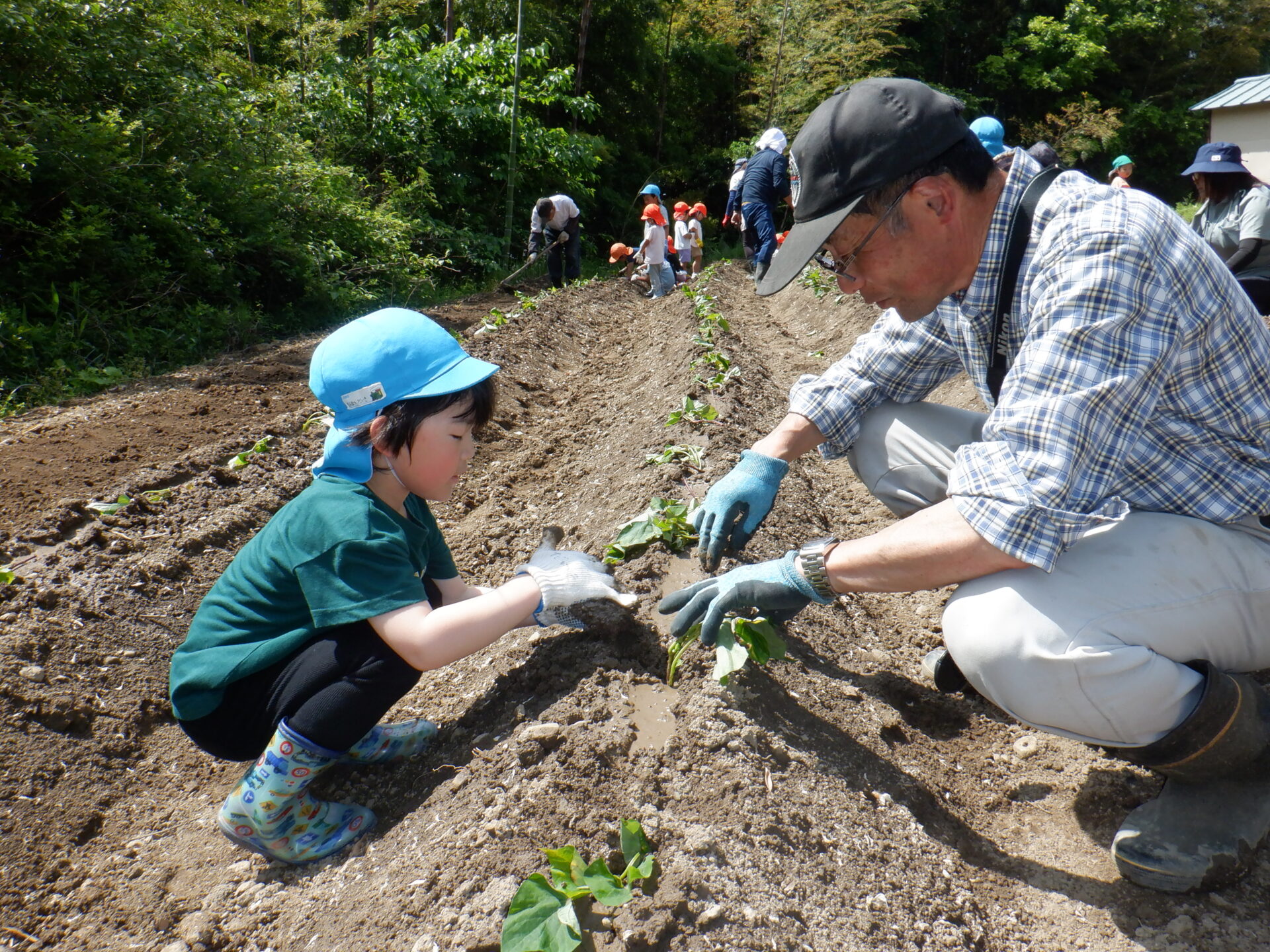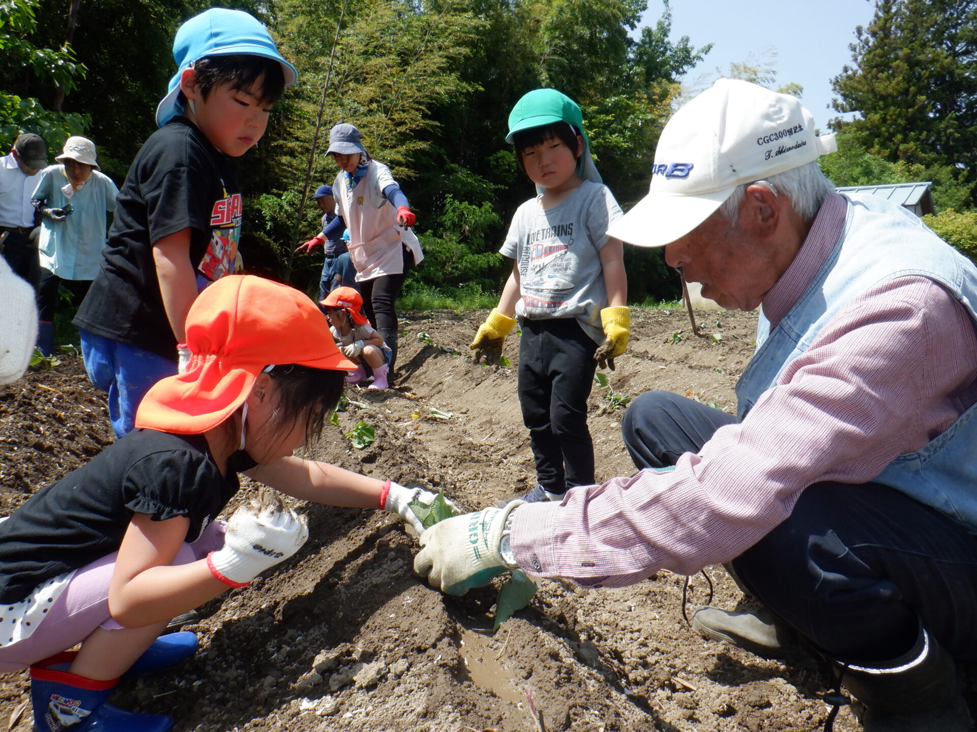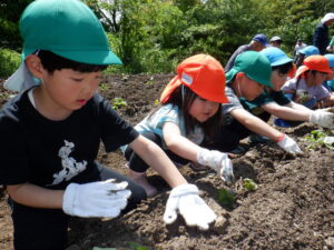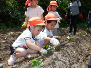 5月中旬、保育園近くの自治振興センターの畑に出かけ、さつまいもの苗植えを行いました。
