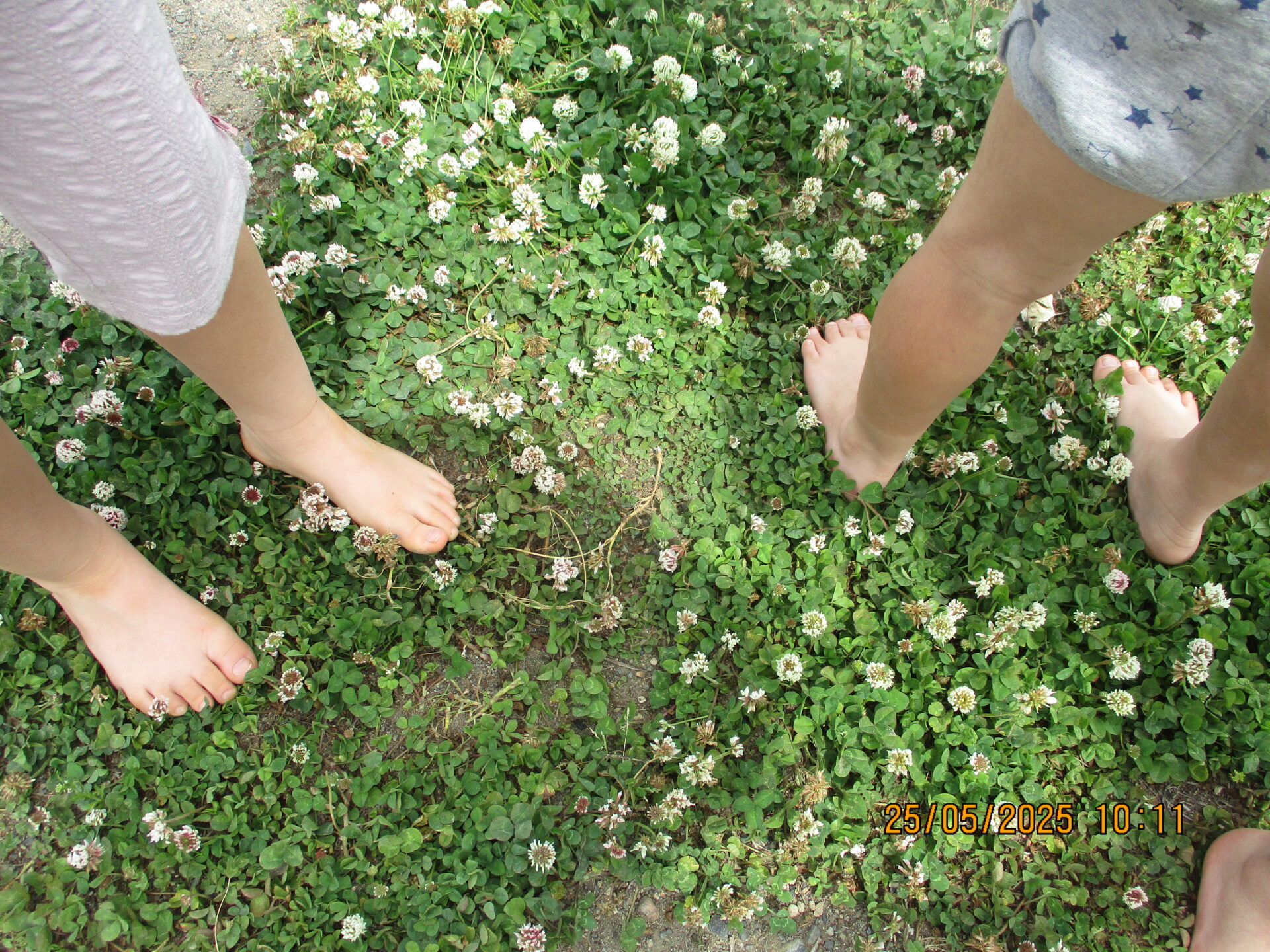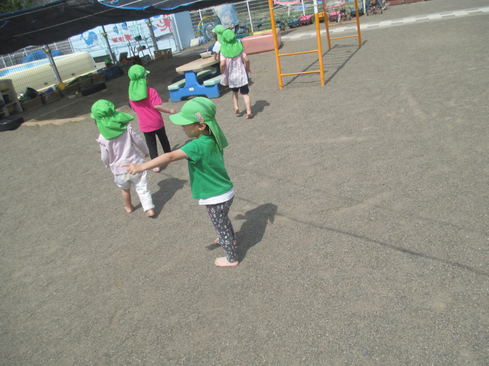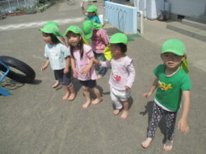 幼児の遊んでいる姿をみて、未満児クラスも興味を示し自然と裸足遊びが始まった。異年齢での楽しい交流に繋がるいい活動になった。