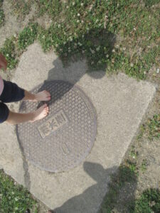 ・コンクリートやマンホールに乗ると温度が違うことに気づく姿があった。